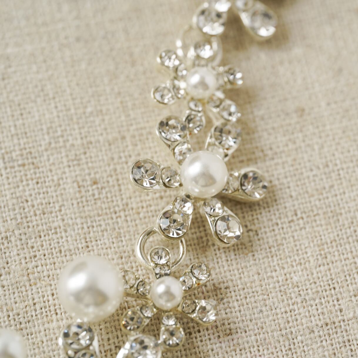 Material: Brass, silver metal plating, rhinestone, costume pearl