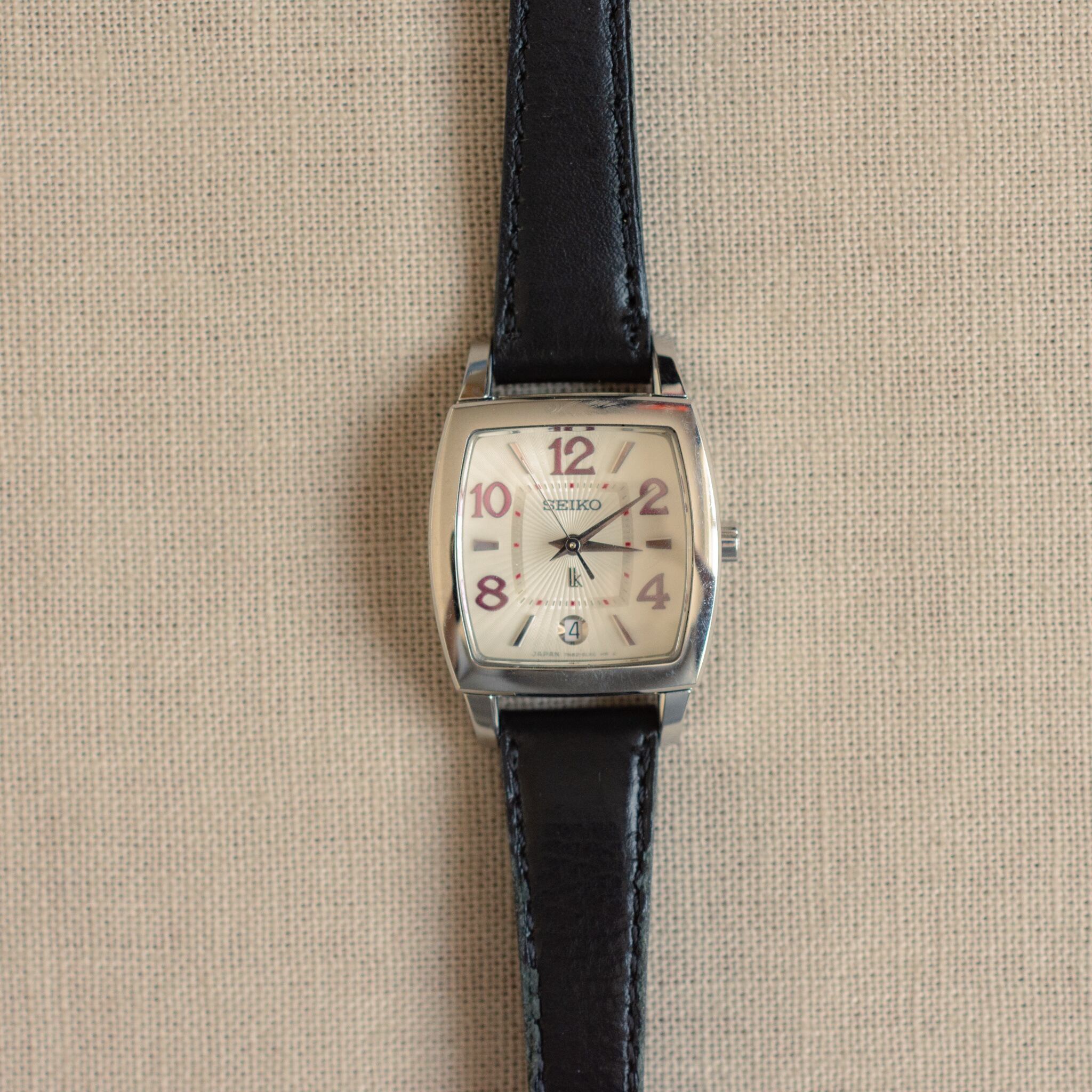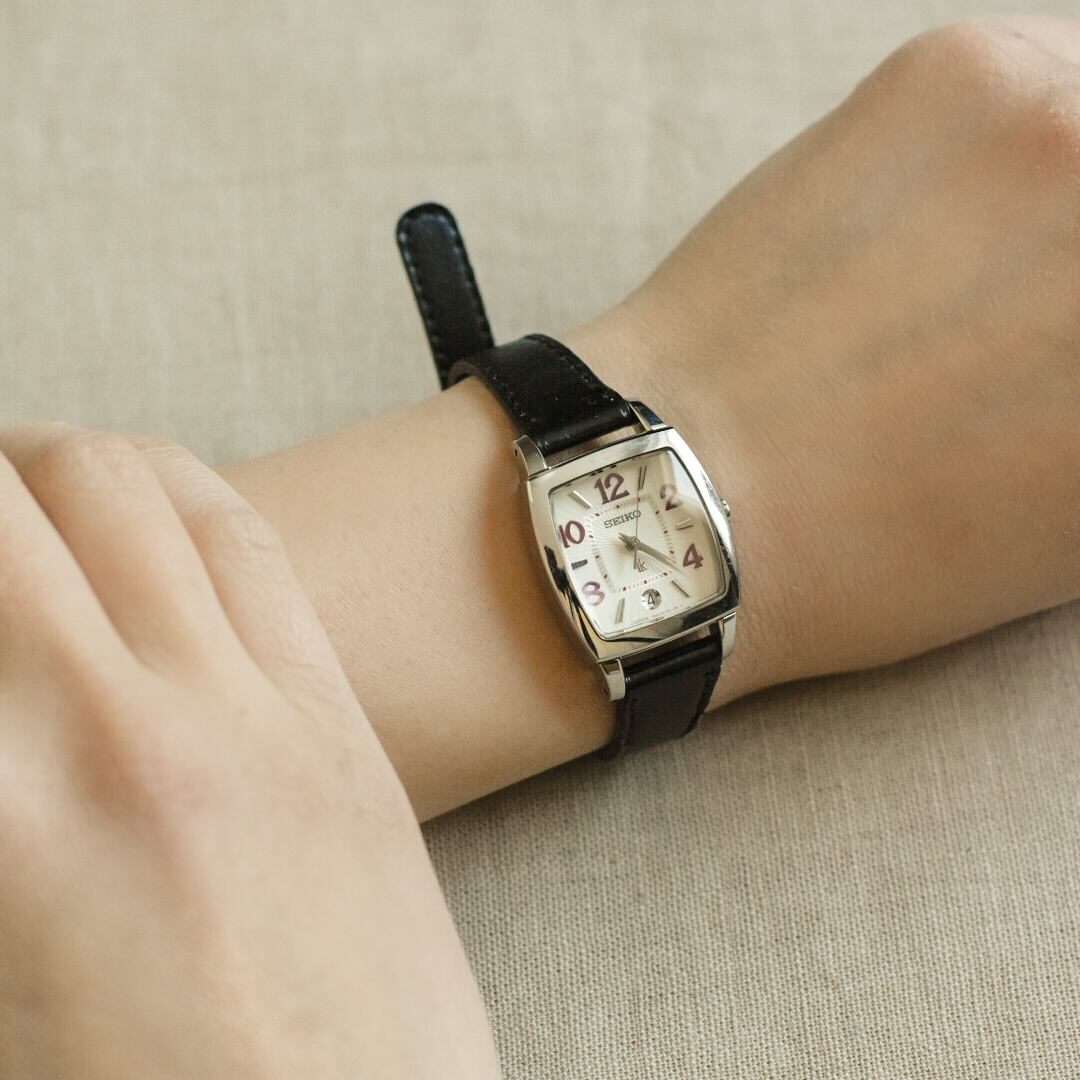 This Seiko vintage watch blends modern minimalism with classic sophistication, featuring a crisp white dial with bold typography, a sleek silver-tone frame, and a matte black leather strap. The detailed design of the watch face exudes an intellectual, academia-inspired charm, making it a unique yet versatile piece. With its understated elegance, this timepiece seamlessly integrates into any wardrobe, offering a refined touch to both casual and formal ensembles. A well-preserved Seiko vintage watch of this style is a rare find, making it a treasured addition for collectors and style enthusiasts alike.
