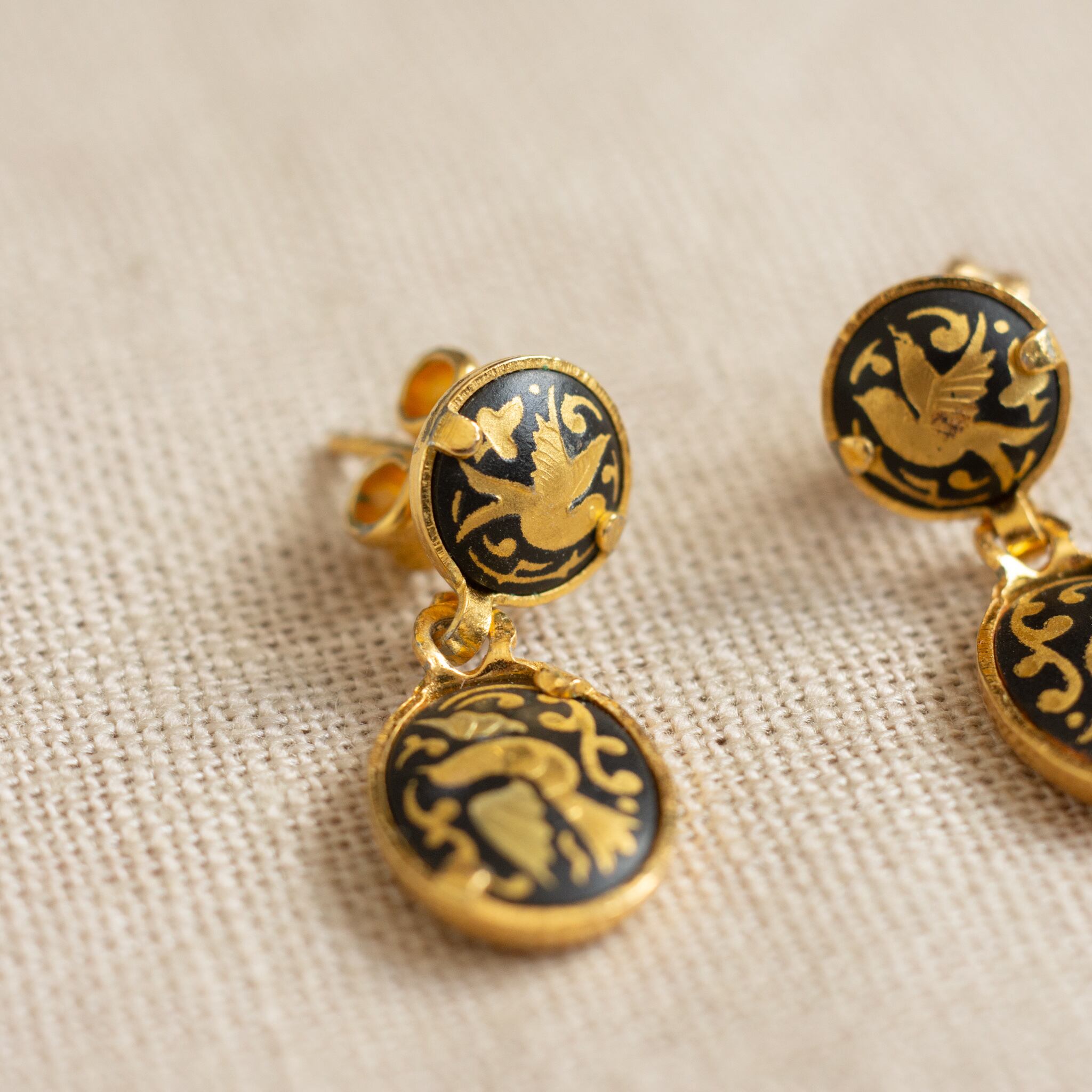 These vintage Damascene earrings are a rare find, featuring golden birds in flight against a matte charcoal backdrop. The intricate detailing and rich texture embody the artistry of this technique, making each earring feel like a miniature masterpiece. Their graceful movement as they sway adds to their allure, catching the light beautifully with every step. While Damascene jewelry is a beloved classic, this particular earring design is especially rare, making it a unique addition for collectors and vintage jewelry enthusiasts.