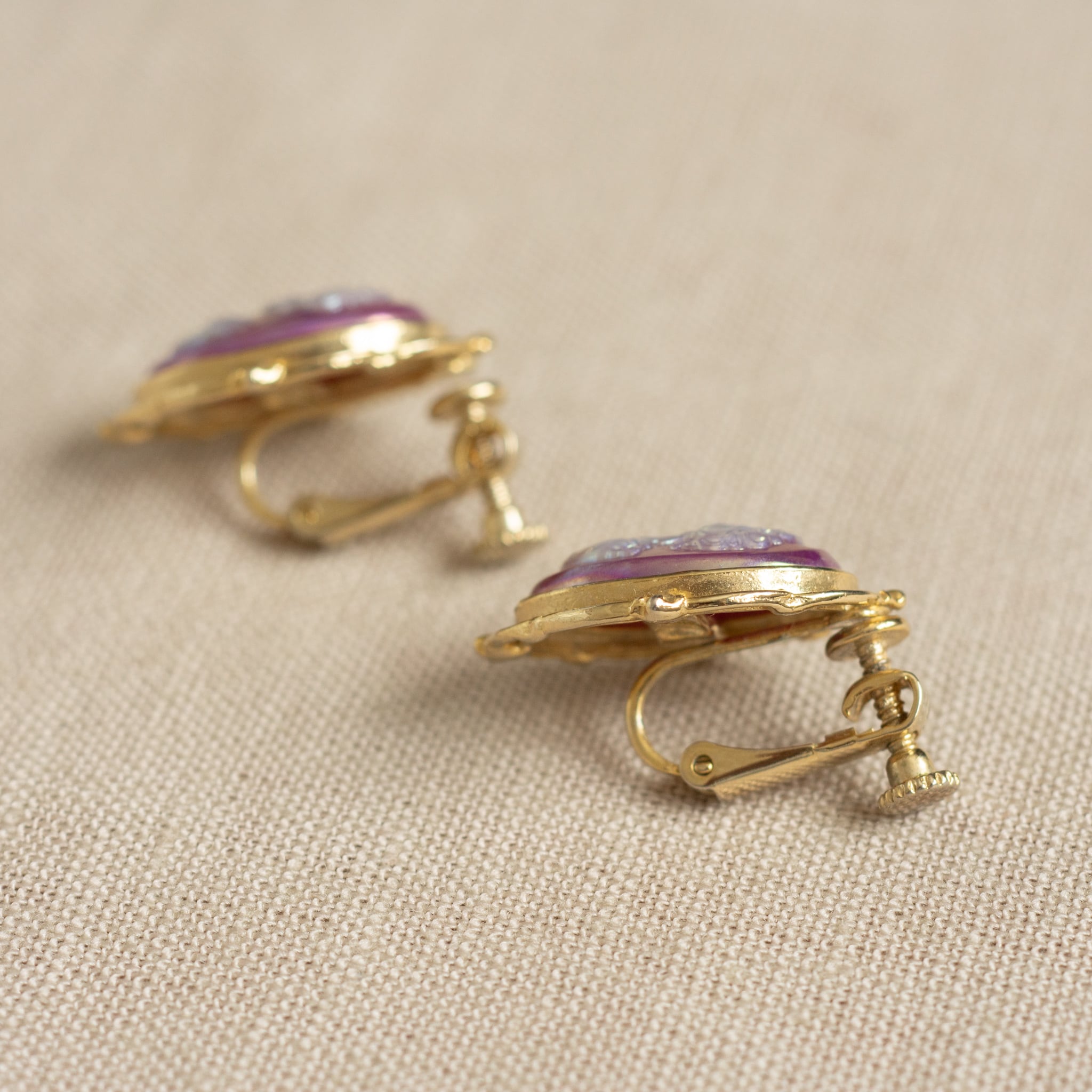 These vintage cameo earrings capture the essence of timeless elegance with their delicately engraved cameo set in iridescent Lucite. The subtle aurora-like sheen enhances the intricate detailing, while the soft rose pink and bone white tones lend a gentle, refined presence to the ear. A beautifully crafted openwork gold frame adds an airy, romantic touch, accentuating the graceful silhouette of the cameo. Uniquely designed so that the cameos face each other when worn, this thoughtful detail reflects the meticulous craftsmanship of vintage jewelry.