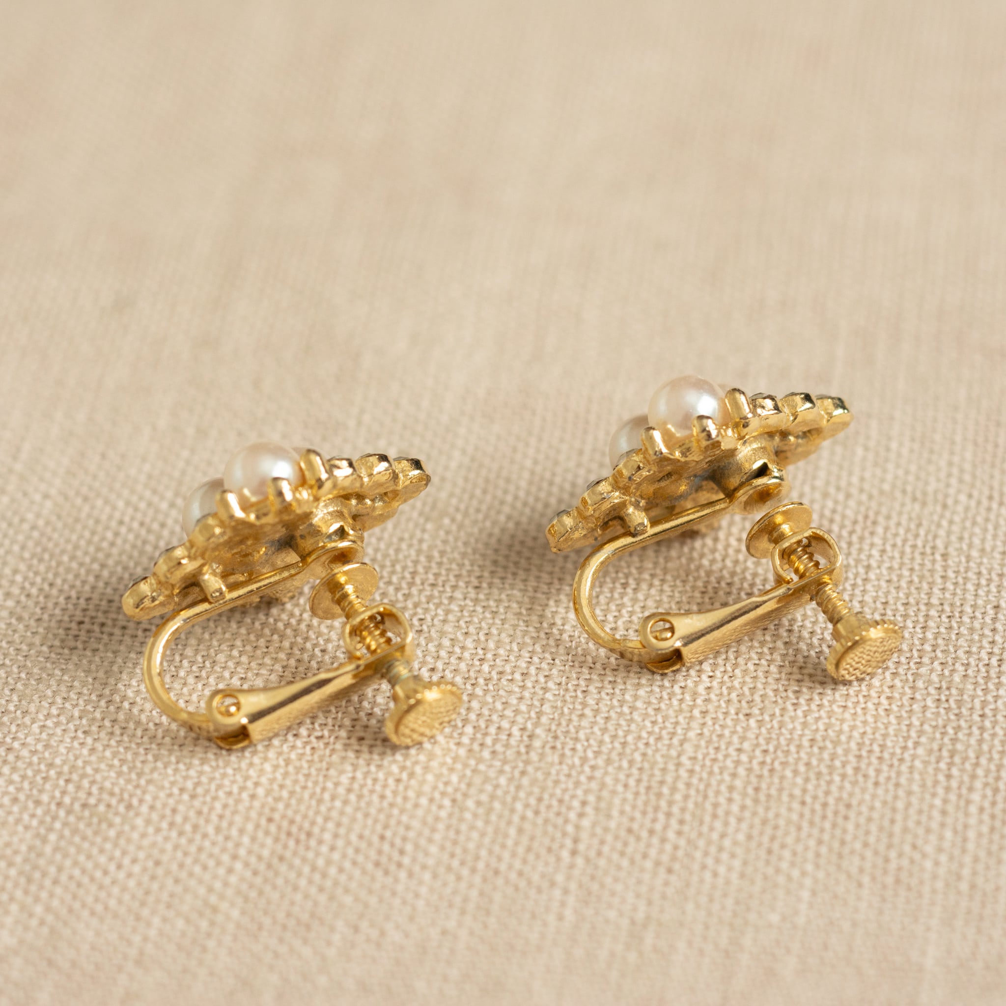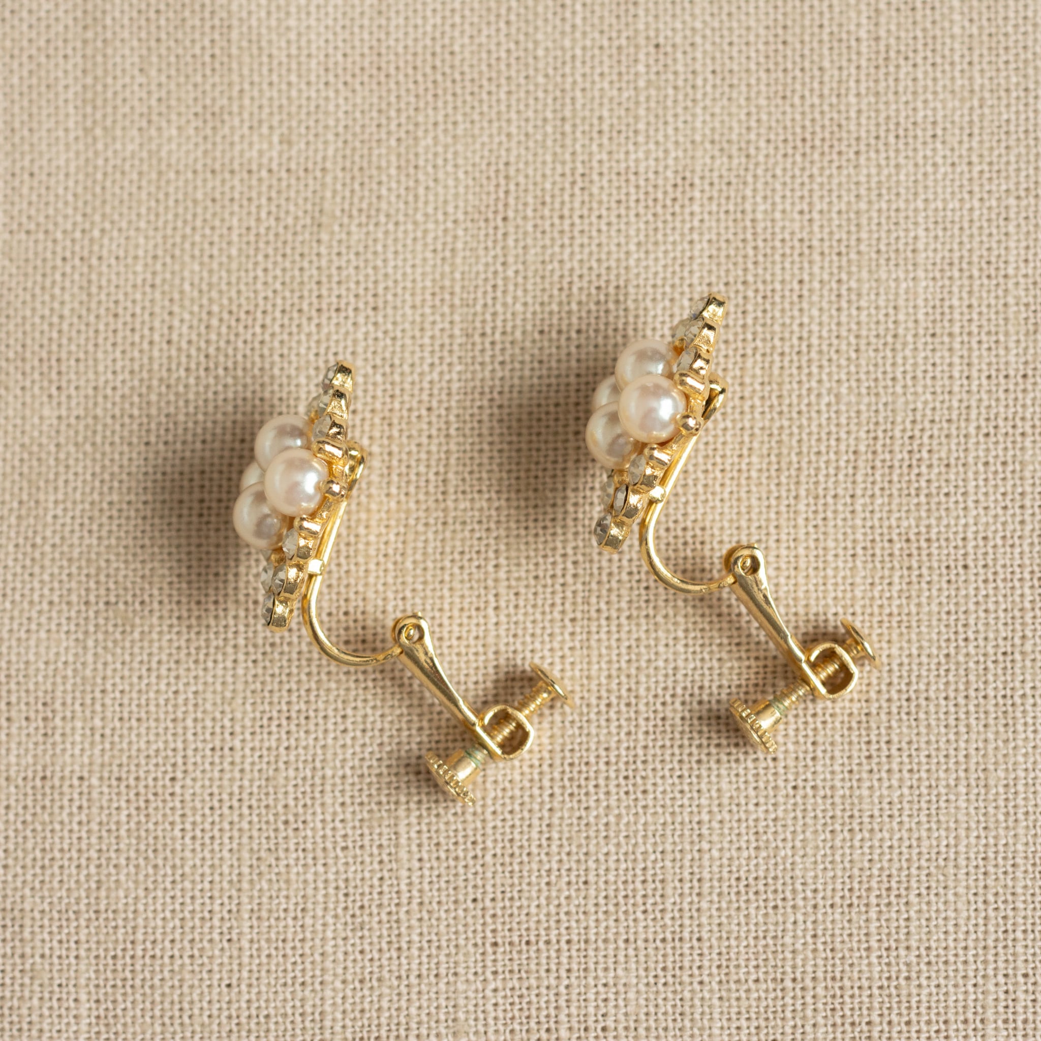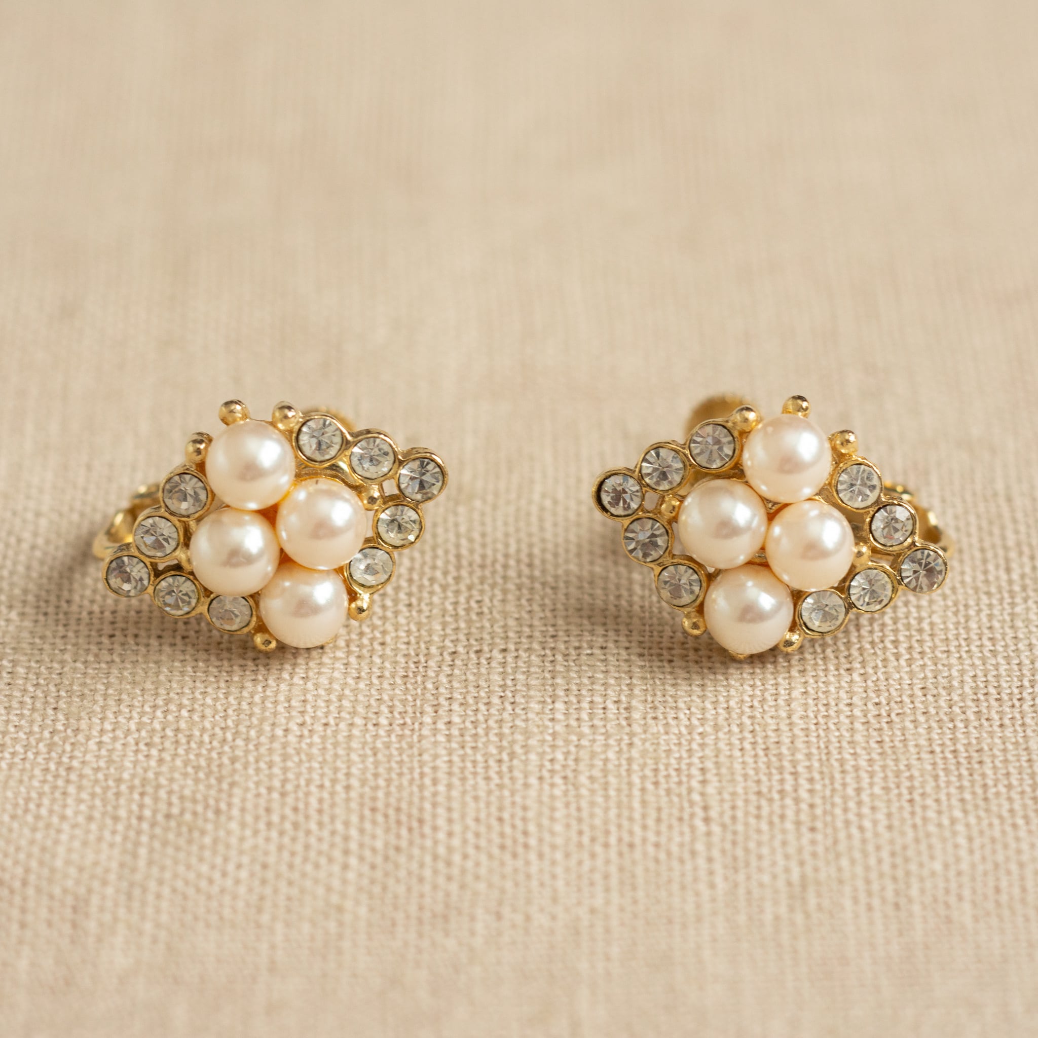 These vintage earrings exude quiet sophistication, featuring a symmetrical arrangement of soft, rounded pearls at the center, framed by a delicate pavé of tiny shimmering rhinestones. Their petite form and balanced design allow them to sit gracefully against the ear, offering an understated yet refined touch. The gentle luster of the pearls and the subtle sparkle of the pavé brighten the face with an effortless elegance. Perfect for moments when you want to add a hint of radiance and poise to your ensemble.