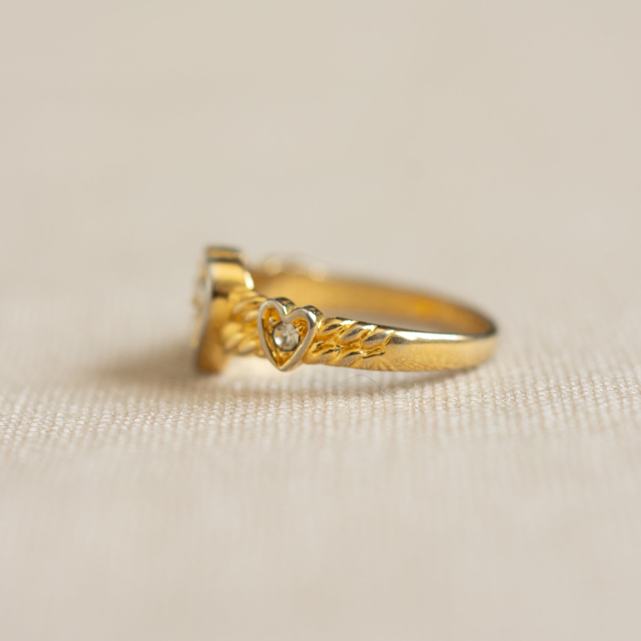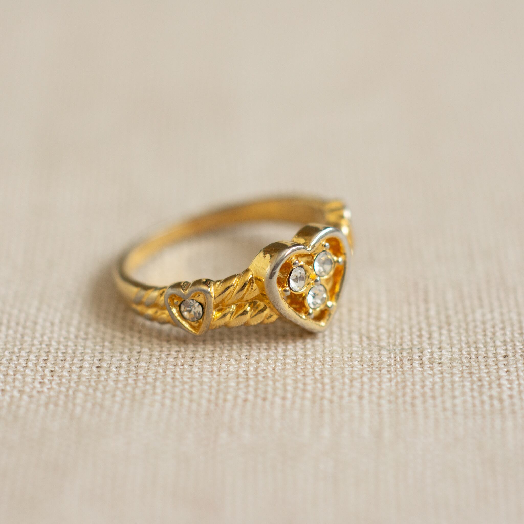 This vintage ring captivates with its refined metalwork and delicate rhinestone-studded heart motif. The symmetry of the central heart, flanked by two tiny side hearts, enhances its charm while lending an air of graceful balance and elegance. The openwork heart design softens the sweetness, creating a classic, sophisticated appeal. The sturdy yet delicate band ensures a comfortable fit, making it a pleasure to wear. Perfect for adding a subtle sparkle to your hands, this piece also pairs beautifully with other gold rings for a stylish layered look.
