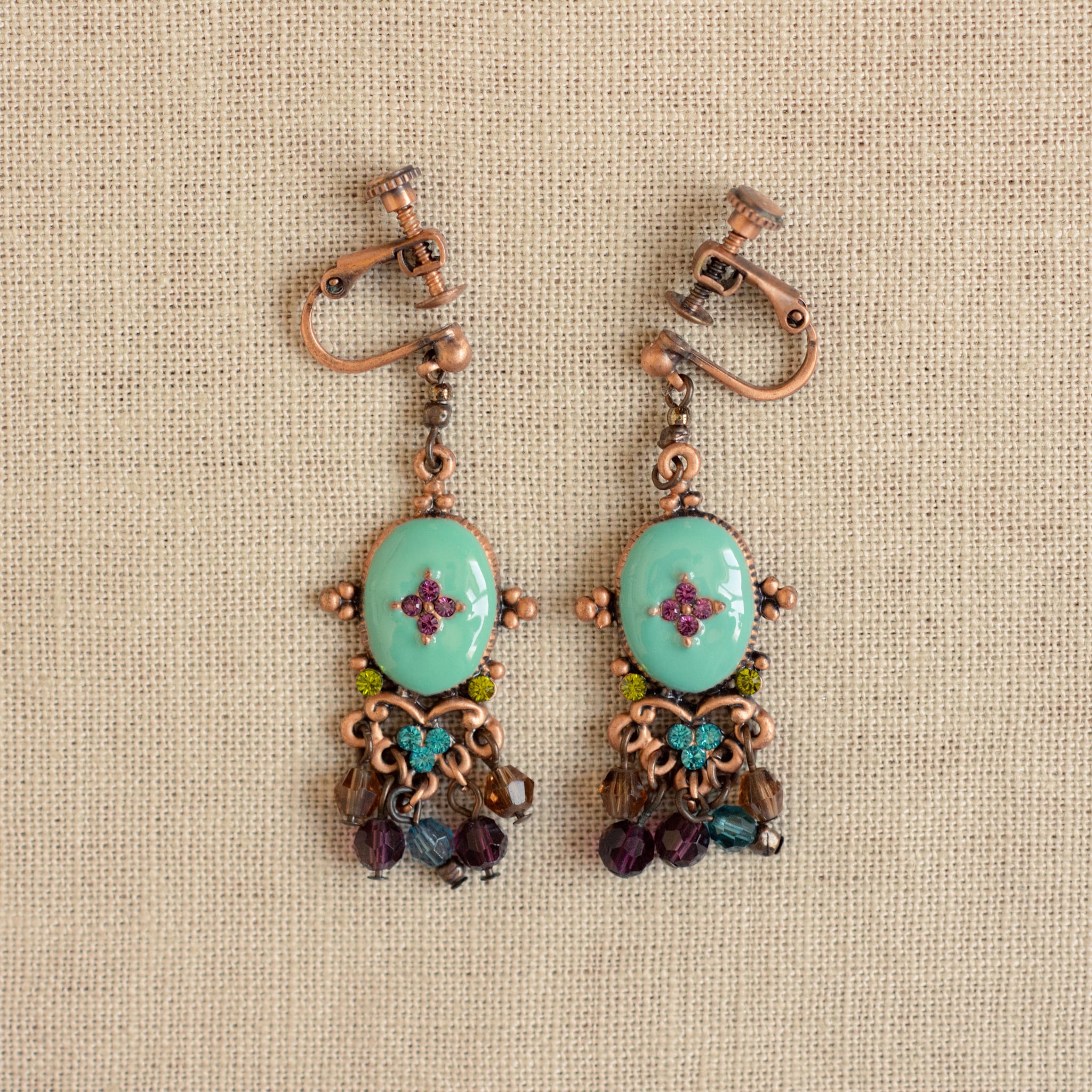 職人技が光るエナメルワークと、ボヘミアンなガラスビーズディテールが印象的なヴィンテージイヤリング。ミントグリーンのエナメルに、センターのラインストーンがクラシカルなアクセントを添え、揺れるビーズのフリンジが華やかさをプラス。