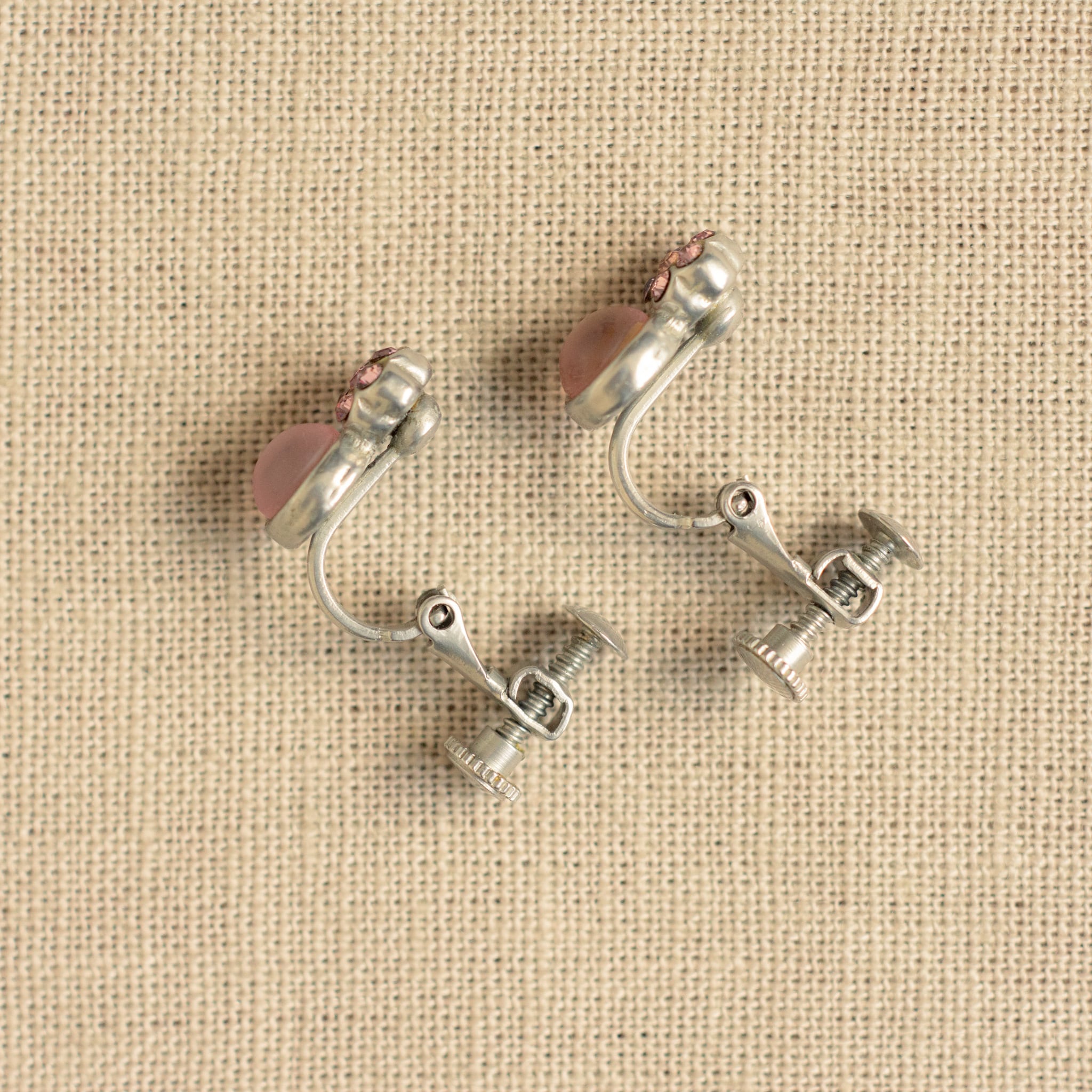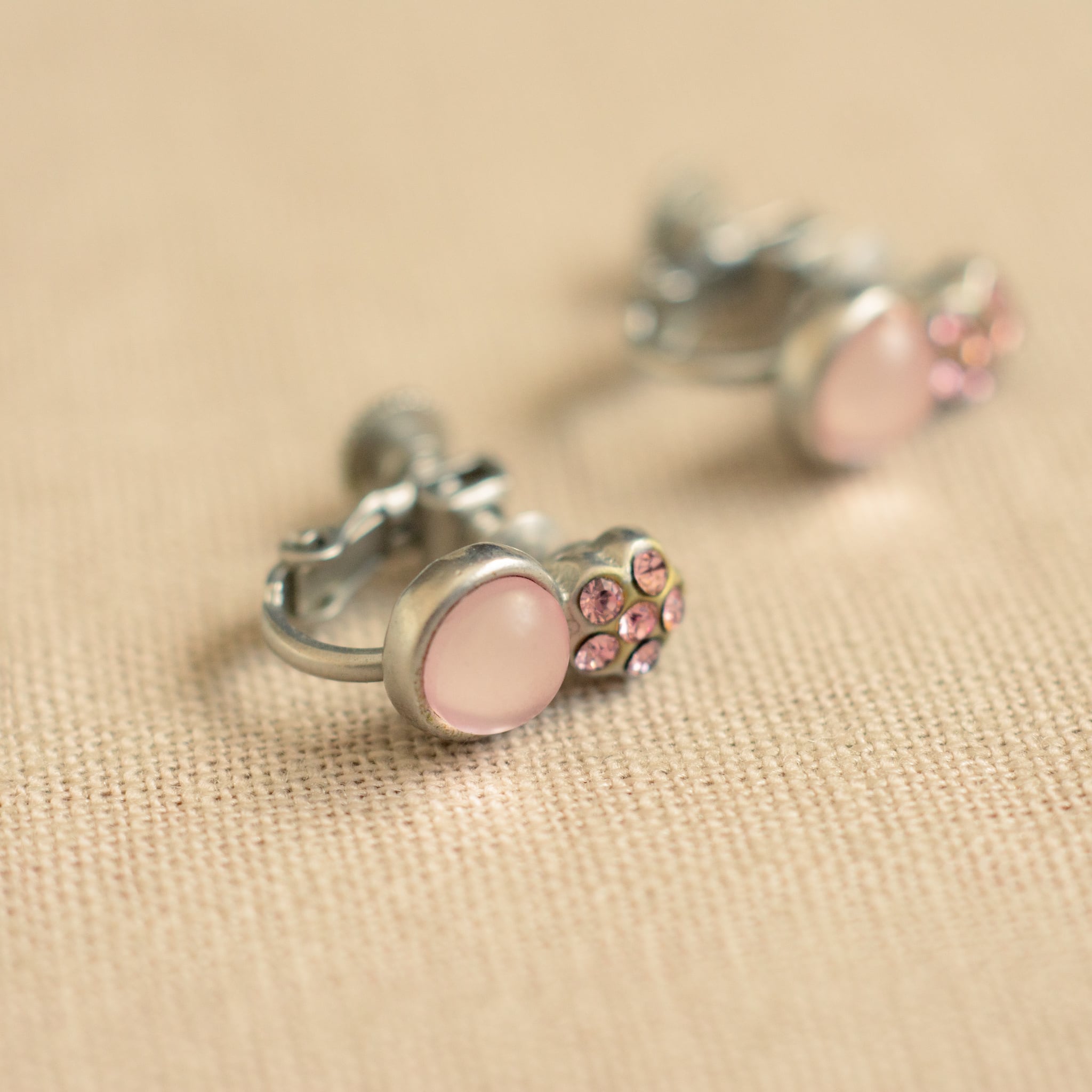 These vintage earrings balance soft femininity with a contemporary edge, featuring a tiny floral motif adorned with delicate rhinestones alongside an abstract circular charm crafted from soft pink glass. The combination of geometric precision and organic softness creates an intriguing contrast, while the gentle pink tones keep the look refined and sophisticated.