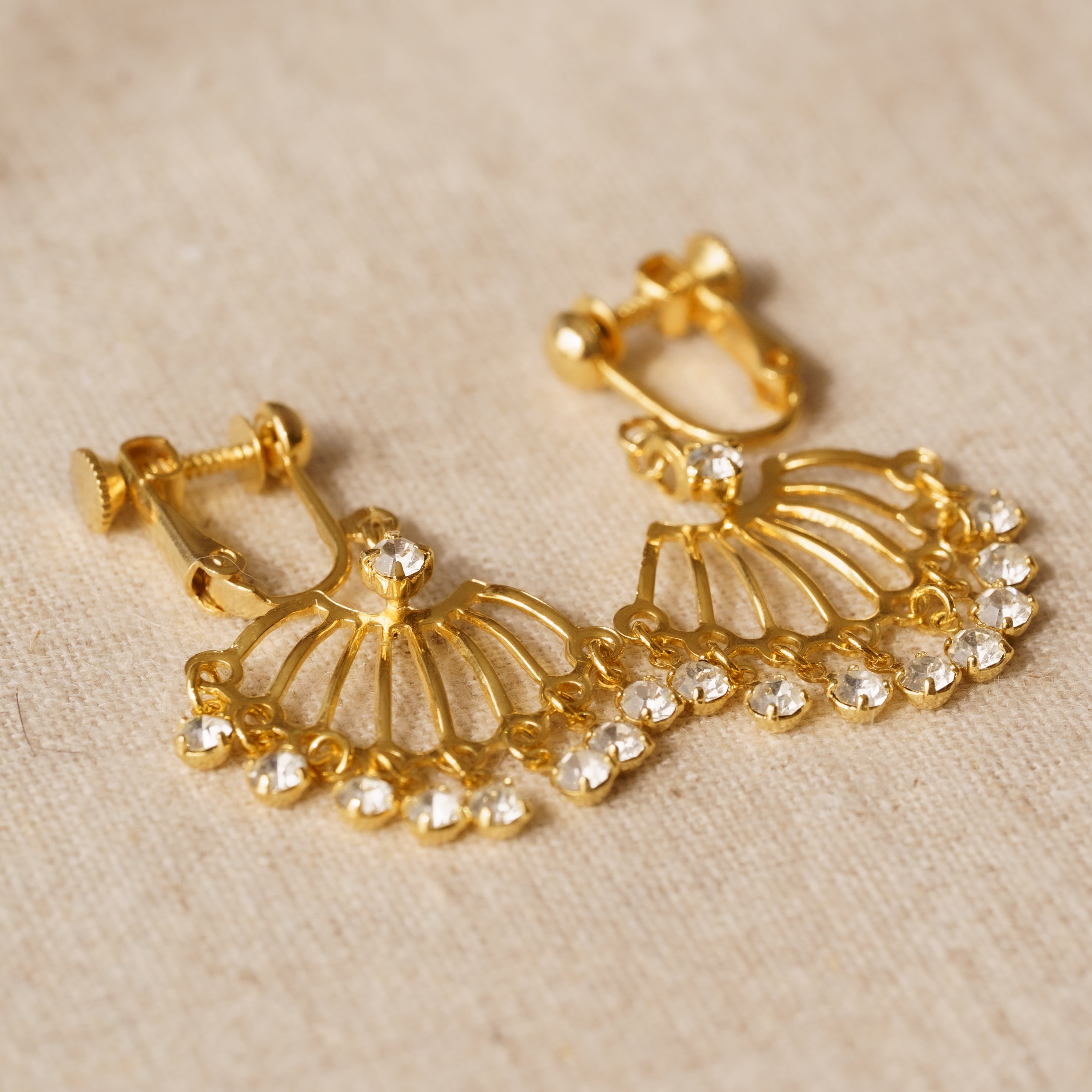 アール・デコ調のシンメトリーデザインが美しい、扇(ファン)を思わせるヴィンテージイヤリング。繊細なゴールドメタルのラインと極小のラインストーンが絶妙なコントラストを生み、揺れるたびに優美な輝きをプラスします。