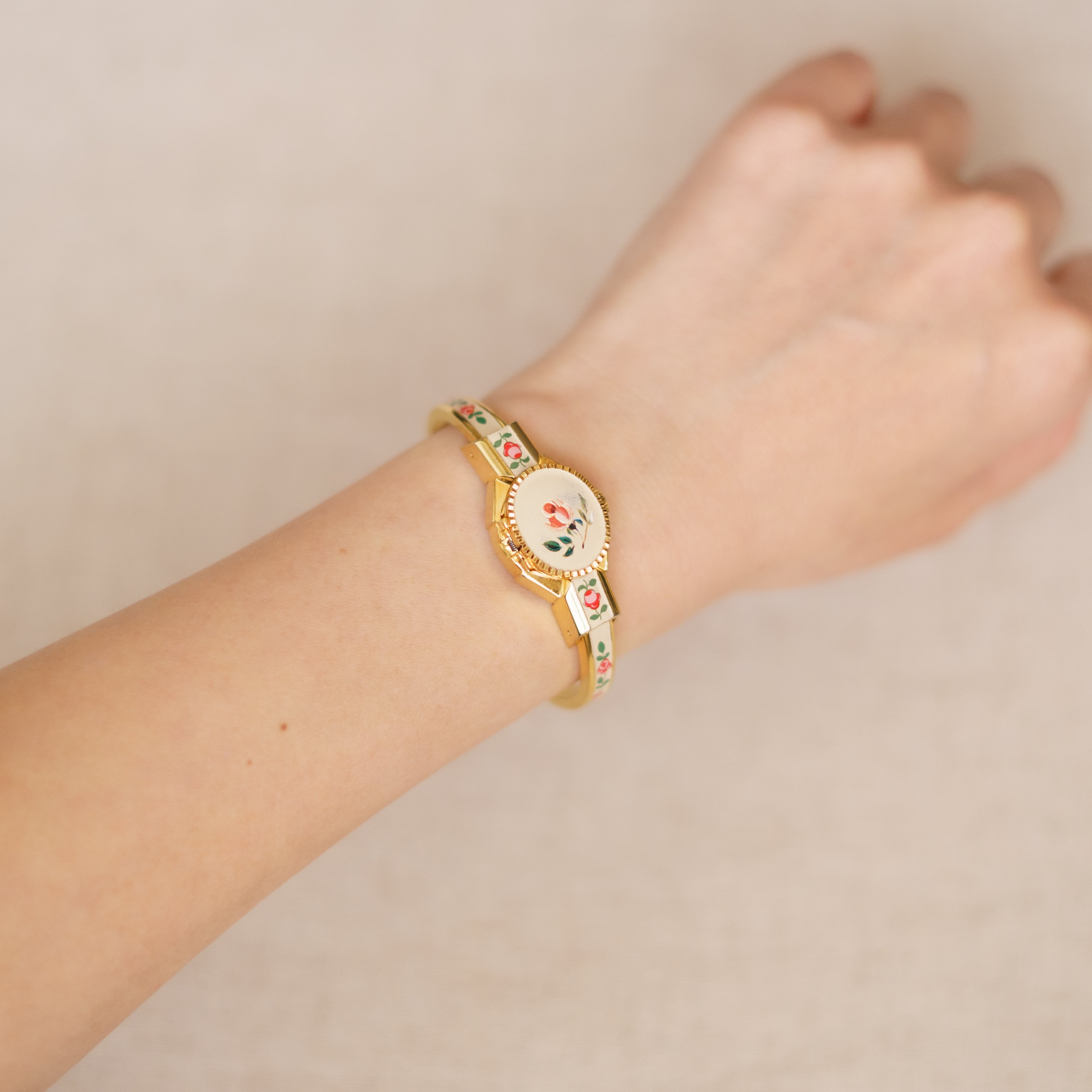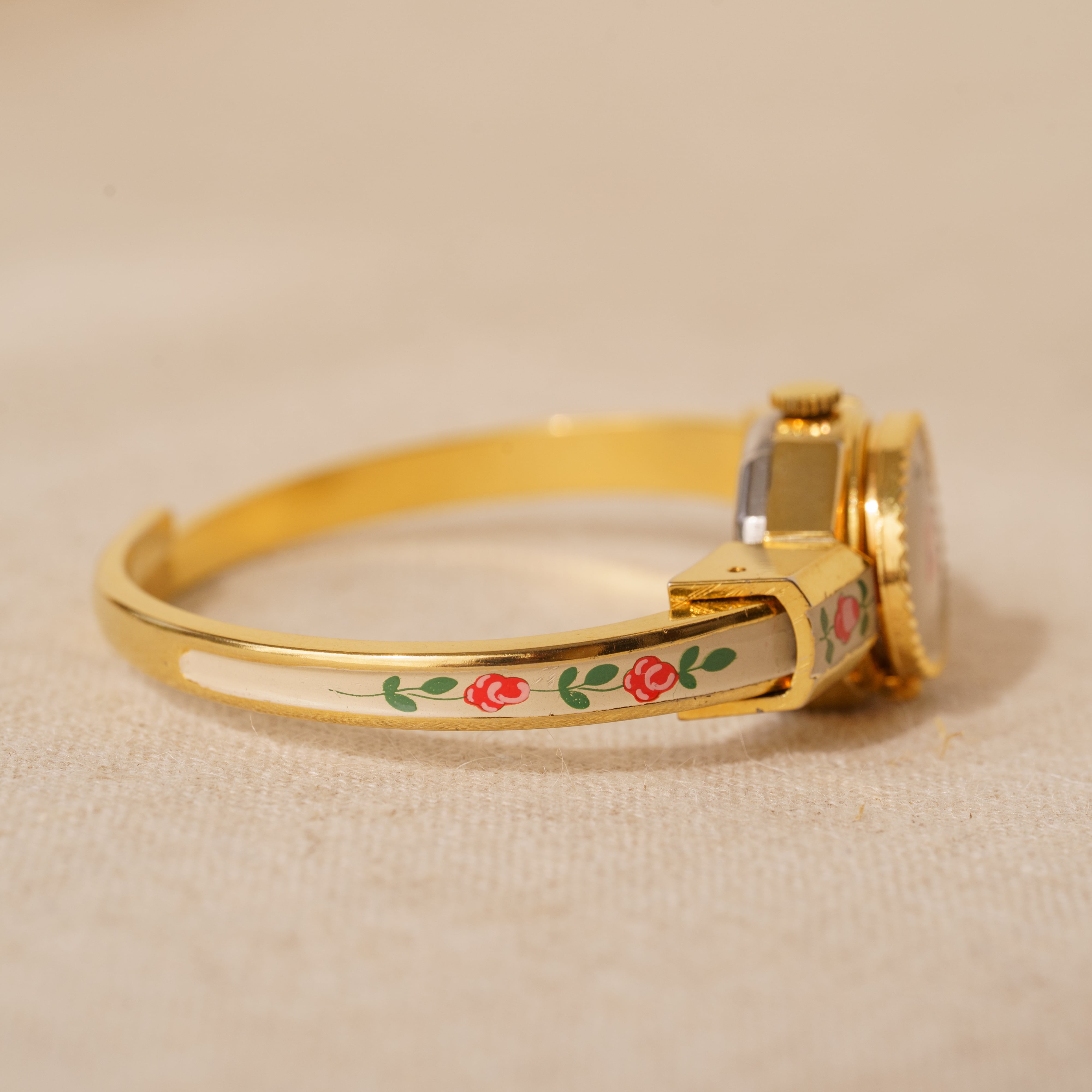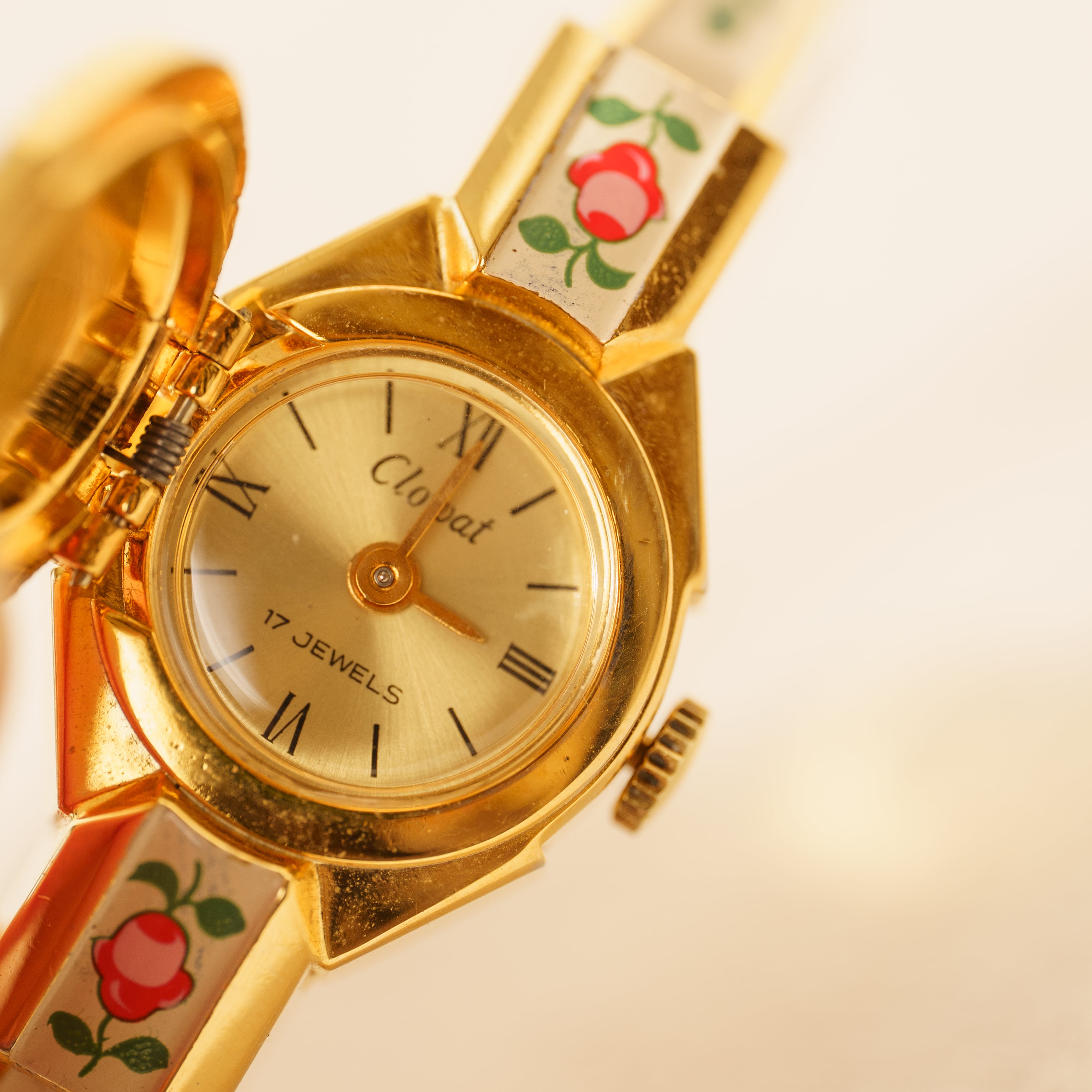 This vintage Clowat watch stands out with its exquisitely detailed floral enamel work, bringing a sense of charm and delicacy to your wrist. The soft gold tone of the vintage metal beautifully complements the dainty hand-painted flowers, creating an elegant harmony. The cover opens to reveal a subtly lustrous dial, adding a touch of jewelry-like sophistication.
