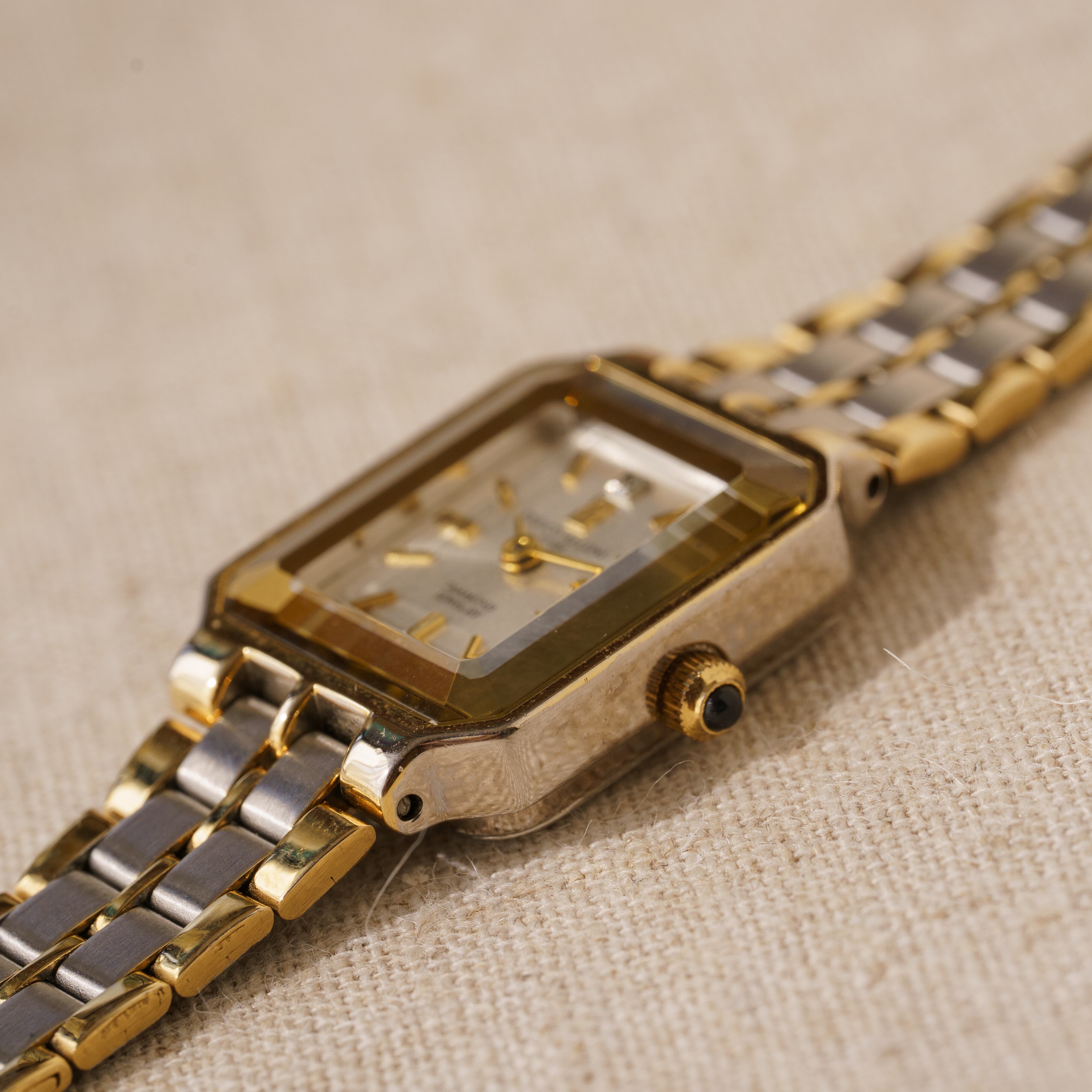 A refined expression of 1980s-90s Italian design, this vintage Enrico Alloni watch features a bold square frame and a striking two-tone bracelet in gold and silver. Known for combining Swiss movement with Italian styling, Enrico Alloni timepieces embody timeless elegance and practical sophistication. Though not widely produced, their watches gained recognition in Europe for their architectural silhouettes, balanced proportions, and luxurious yet wearable appeal.