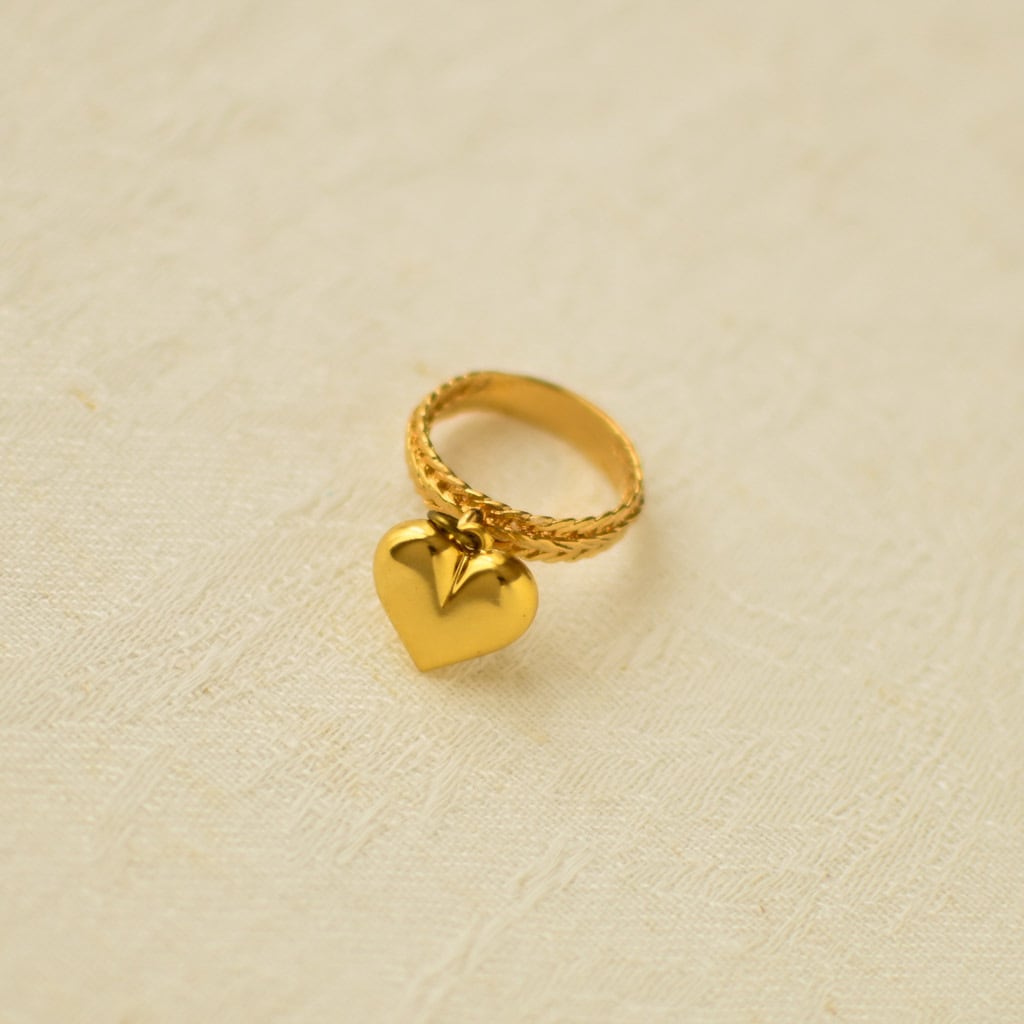 A charming vintage ring adorned with a dangling gold heart, this piece radiates both softness and strength in its design.