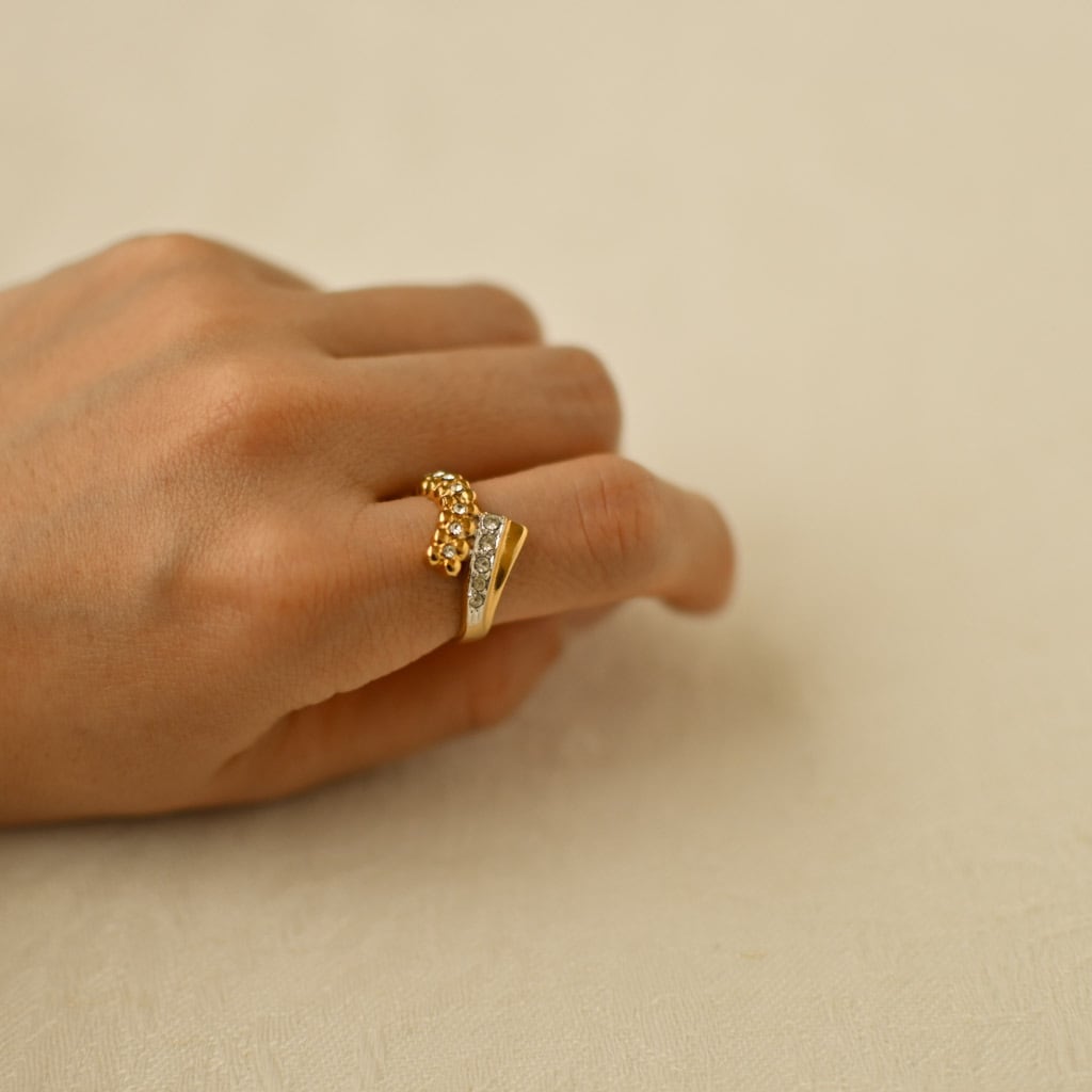 This vintage ring features a striking contrast between a rhythmically arranged row of delicate, flower-like details and a smooth golden line. The mixed-metal look adds a touch of playful charm while maintaining a mature elegance through its subtle shine.The gentle V-shape of the band flatters the finger, offering a clean and refined silhouette. With its vintage character and everyday wearability, this piece blends charm with versatility.