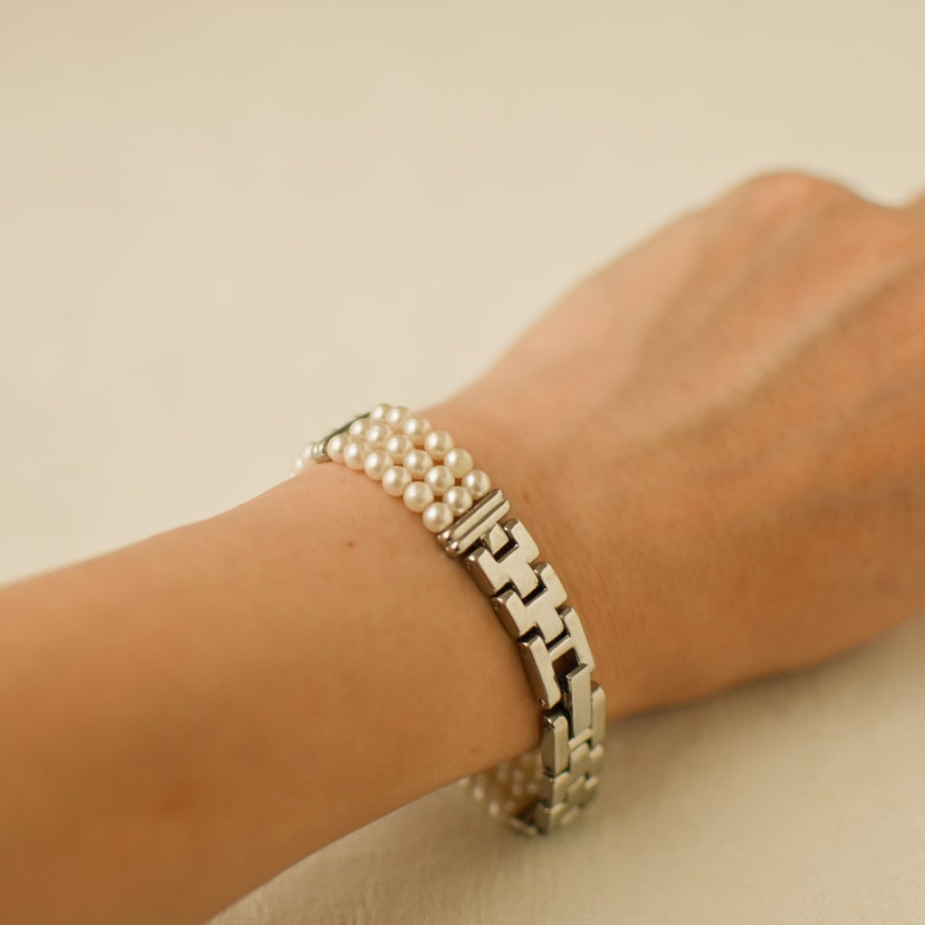 クラシカルなフェイスと、3連パールブレスレットが印象的なヴィンテージウォッチ。