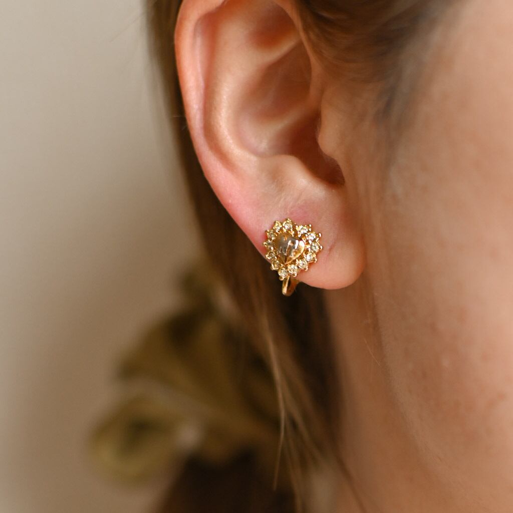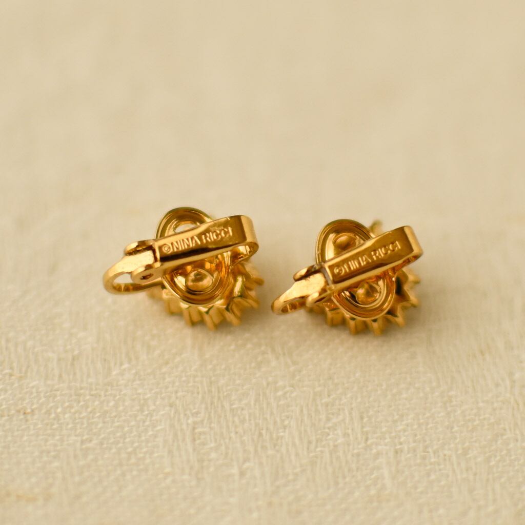 フランスの老舗ブランドNina Ricciによる、1980sのヴィンテージイヤリング。中央にはブランドのイニシャル“NR”が刻まれたハートモチーフ、そのまわりをぐるりと囲むラインストーンが、光を受けてやわらかに煌めきます。