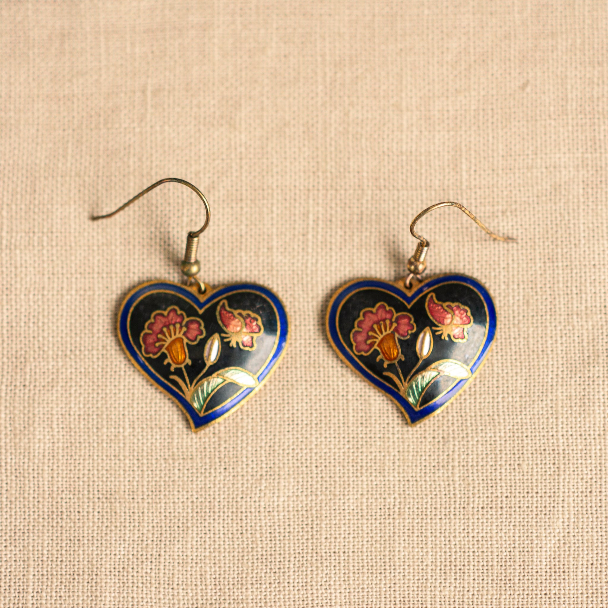 These charming vintage earrings feature heart-shaped enamel pieces adorned with blooming flowers and delicate butterflies. The deep navy background sets off the warm tones of red, gold, and green, creating an elegant yet nostalgic contrast. The back has a fine geometric texture, and the lightweight feel ensures comfortable wear. Their intricate folk-inspired design makes them a statement piece that evokes the artistry of bygone days. Perfect for adding a touch of character to simple blouses or cozy knits.