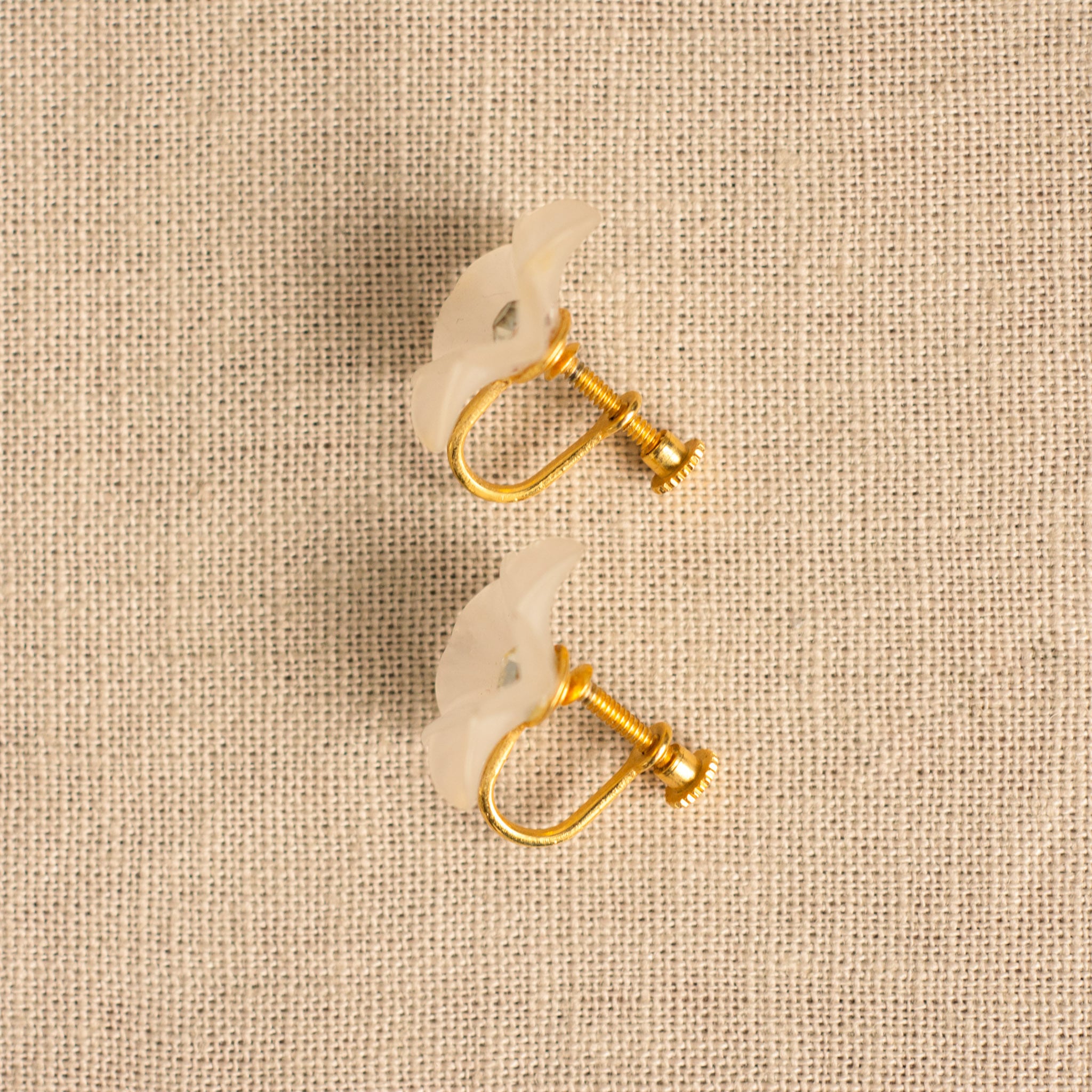 These vintage clip-on earrings bloom softly with frosted white resin petals and a sparkling rhinestone at the center. The matte finish of the translucent petals gives a delicate and airy impression, while the clear rhinestone adds a gentle twinkle to the overall look. The lightweight construction and screw-back design offer comfort for non-pierced ears. These earrings make a perfect pairing with pastel-toned outfits, adding a whisper of elegance to your everyday or springtime style.