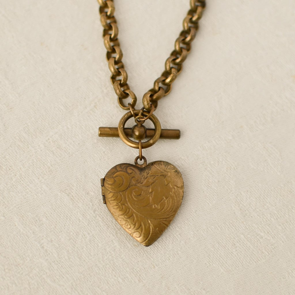A softly aged heart locket anchors this vintage necklace with timeless warmth. The locket’s matte, brushed finish gives it a well-loved character, while its weight and rounded form add a sense of quiet strength. Hung from an antiqued gold-tone chain and secured with a classic toggle clasp, the necklace carries a subtle vintage romance—reminiscent of French keepsake jewelry from the late 20th century.
