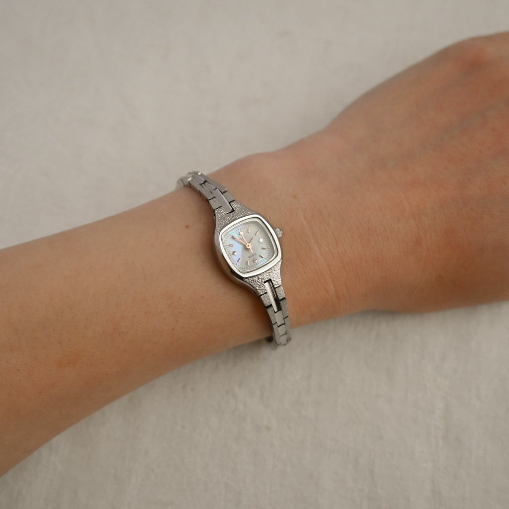 上品なシェルフェイスに、都会的なマットシルバーのフレームと華奢なブレスレットベルトが美しく調和した、Contentのヴィンテージウォッチ。バングルのように手元に馴染み、まるでジュエリーのように身につけられる一本です。光を受けてほのかに輝くシェルのニュアンスが、シルバーのマットな質感と絶妙に重なり合い、凛としたエレガンスを添えてくれます。
