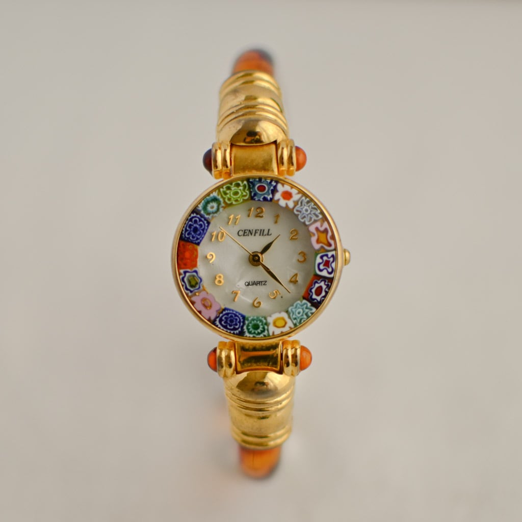 This exquisite vintage watch showcases the exceptional artistry of millefiori glasswork, an ancient Venetian technique whose name means "a thousand flowers" in Italian. The process dates back to ancient Roman times but was perfected on the island of Murano in the 15th century. It involves layering colorful glass canes, fusing them, and slicing them into delicate flower-like patterns that are then set into molten glass—a technique requiring immense precision and skill.