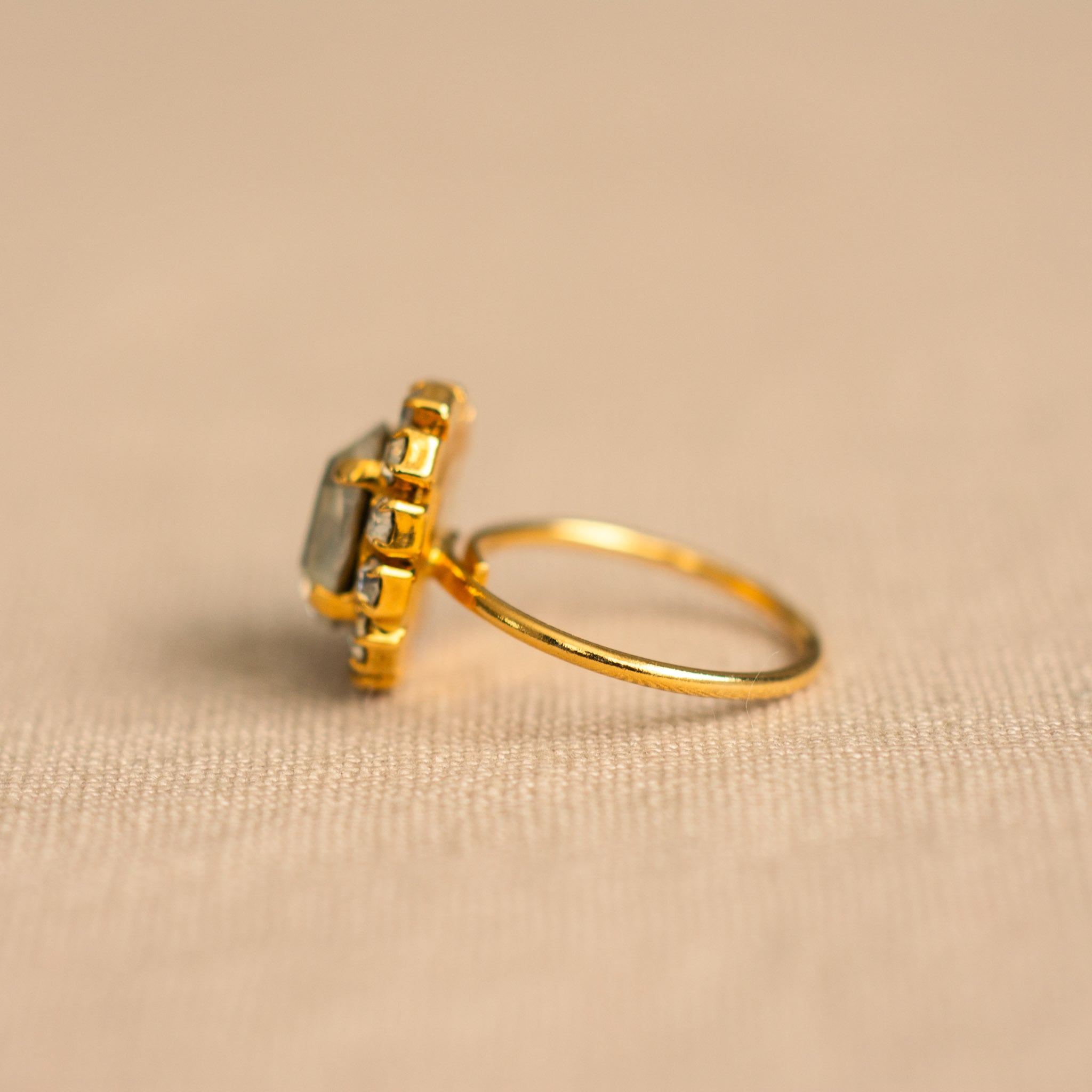 This vintage ring brings timeless charm through its floral-inspired silhouette and softly radiant centrepiece. The faceted oval stone catches the light with a gentle brilliance, surrounded by a halo of clear rhinestones that shimmer with every movement. Set in a warm gold-tone frame, it strikes a delicate balance between vintage charm and contemporary elegance.
