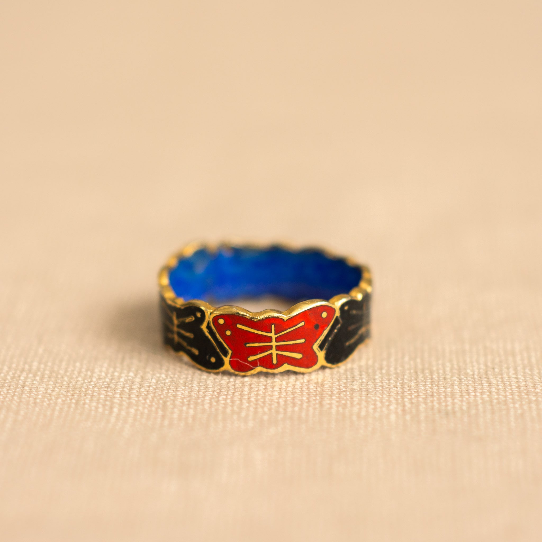 This vintage ring is adorned with delicate butterfly motifs, each bordered in gold and brought to life through the age-old art of cloisonné. A traditional enamelling technique, cloisonné involves using fine metal wires to create tiny compartments (cloisons in French), which are then filled with vibrant coloured enamels and carefully fired — a slow, intricate process that results in jewel-like surfaces full of depth and light.