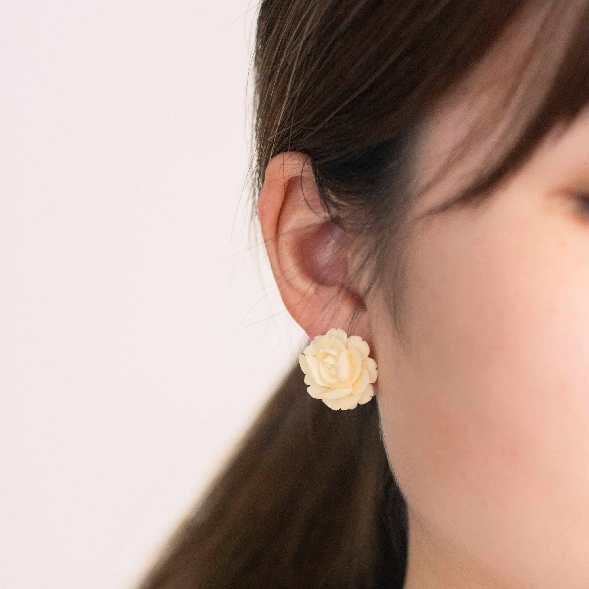 ひとつひとつ丁寧に成形されたルーサイトの薔薇が、そっと咲くように耳元を彩るヴィンテージイヤリング。まろやかなアイボリートーンと、やわらかく重なり合う花びらの立体感が、儚さと気品をあわせ持つ佇まいに。