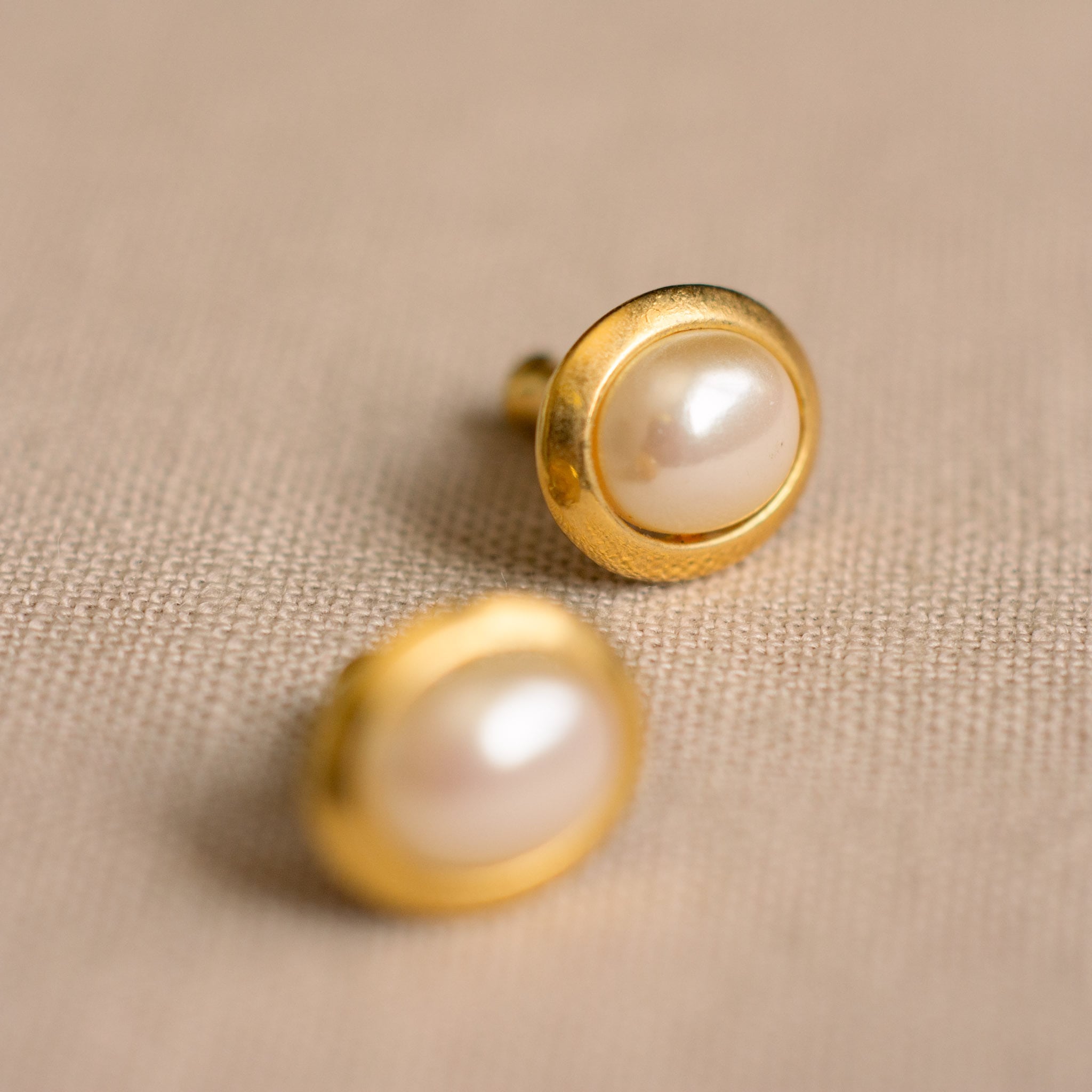 Understated yet elegant, these vintage clip-on post earrings feature a smooth oval-shaped costume pearl, framed by a softly brushed gold-tone bezel. The clean lines and gentle curves give them a refined, minimalist charm, reminiscent of the quiet sophistication found in mid-century modern design.
