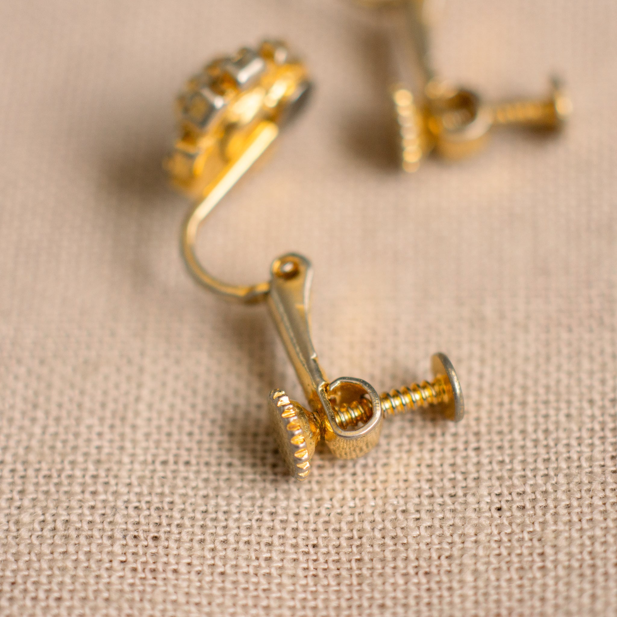 中央に光を宿したような大粒のラインストーンを、小さな輝きがぐるりと囲む、クラシカルで華やかなヴィンテージイヤリング。ゴールドトーンの台座に丁寧にセットされたストーンが、耳元に明るさと華やぎを添えてくれる、小ぶりながらも印象的な一品です。