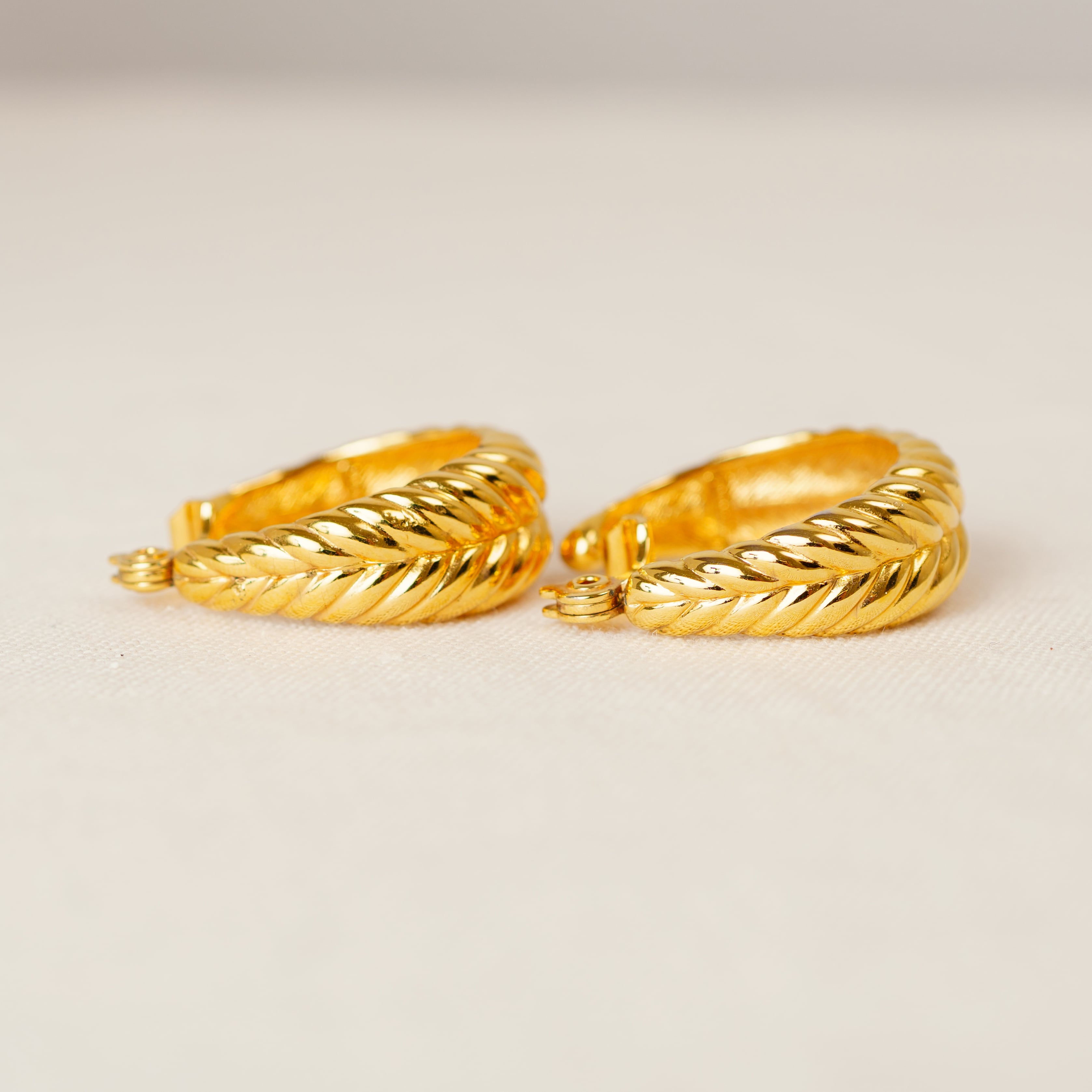 These vintage hoop earrings by Monet offer a refined twist on a classic form. The softly sculpted surface features a leaf-like texture that catches the light beautifully, adding depth and movement to the gold-tone finish. A gentle departure from the typical smooth hoop, this textured design brings subtle dimension and quiet elegance to the ear.