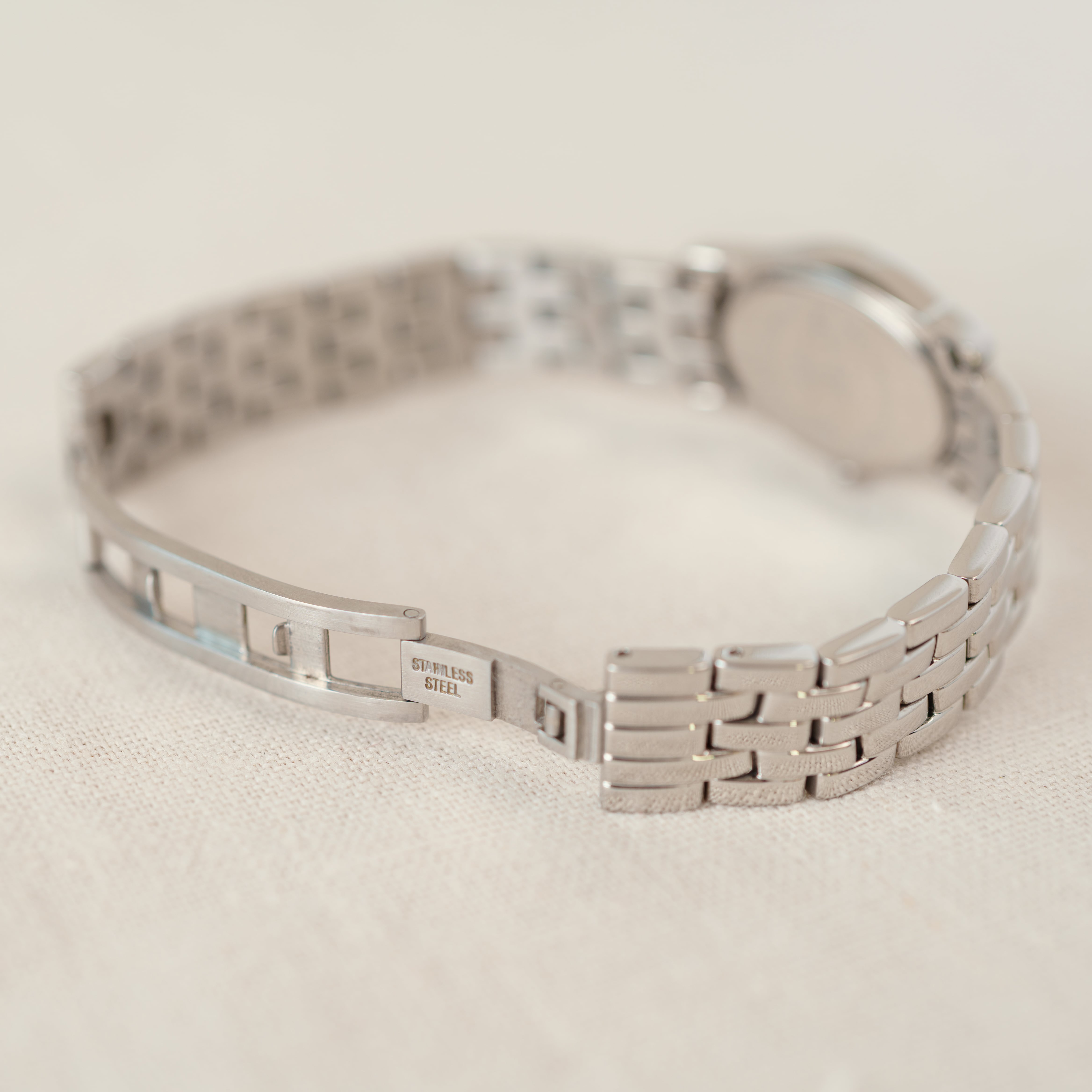 控えめな気品と、ほのかなきらめきが美しく調和した、ヴィンテージのテクノス腕時計。やわらかくカーブを描くオーバルフェイスには、繊細なゴールドのインデックスと、12時位置にひと粒のダイヤモンドがあしらわれ、手元の所作に静かな輝きを添えます。ミニマルなシルバートーンのブレスレットは、滑らかに手首に馴染み、デイリーにもフォーマルにも洗練を加えてくれる一本です。