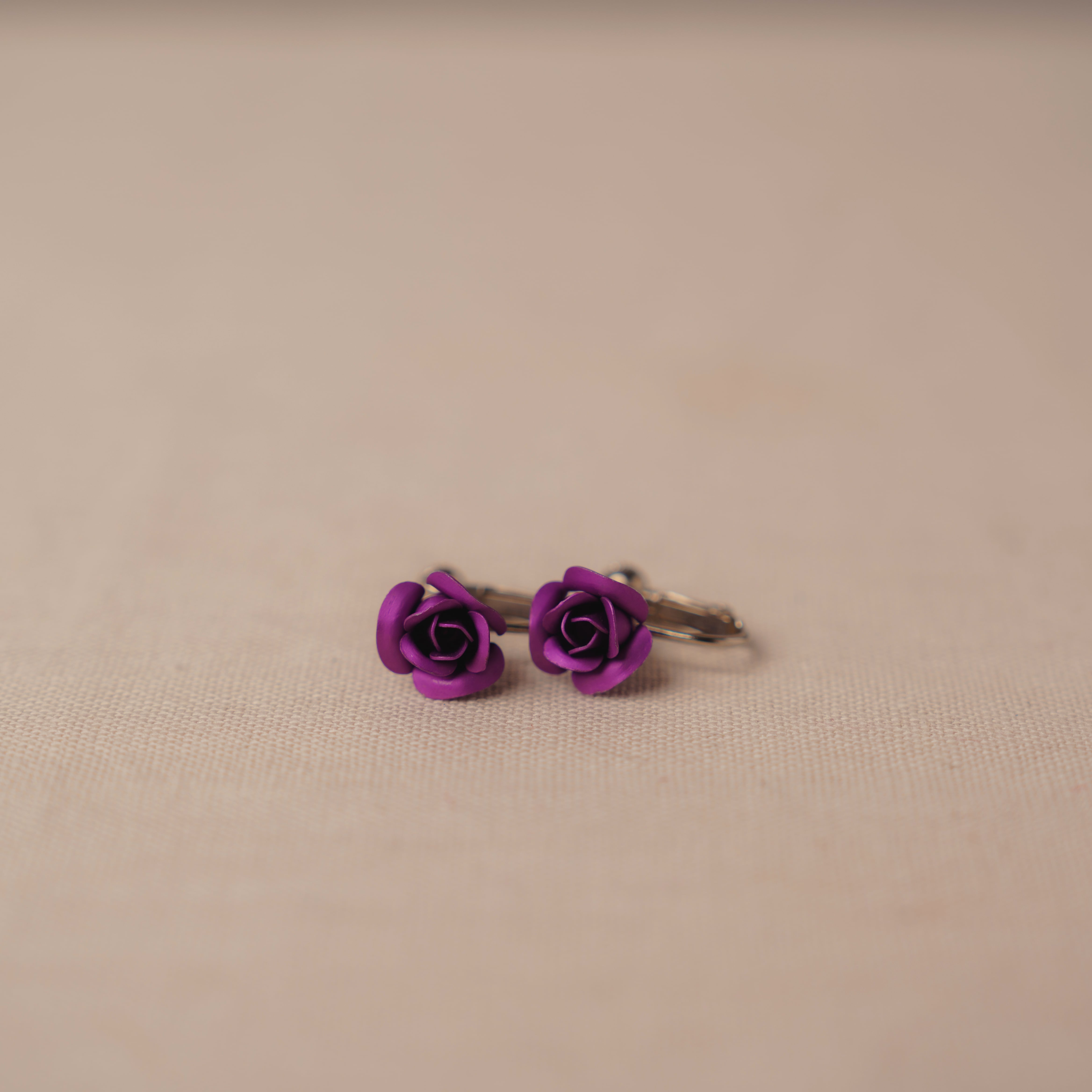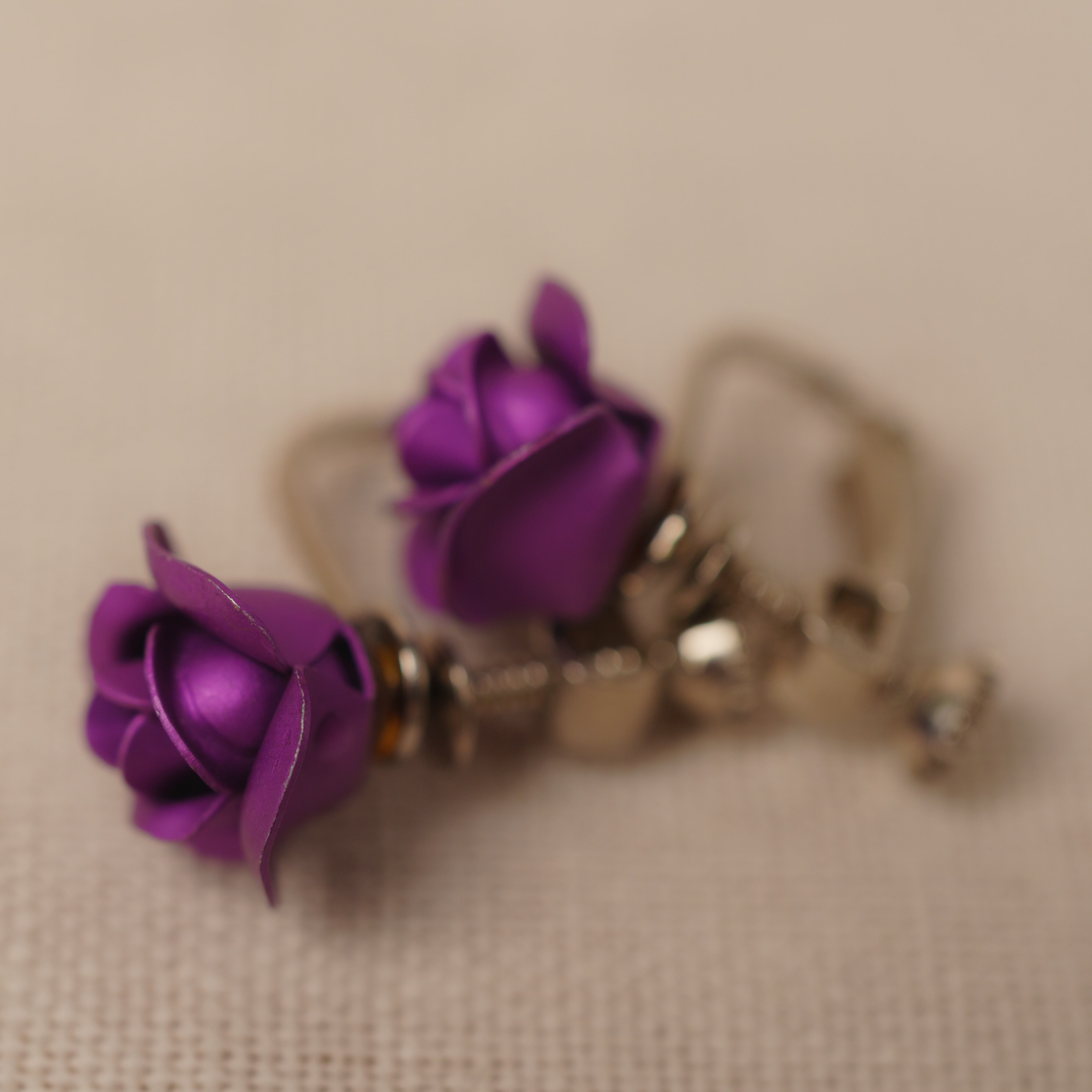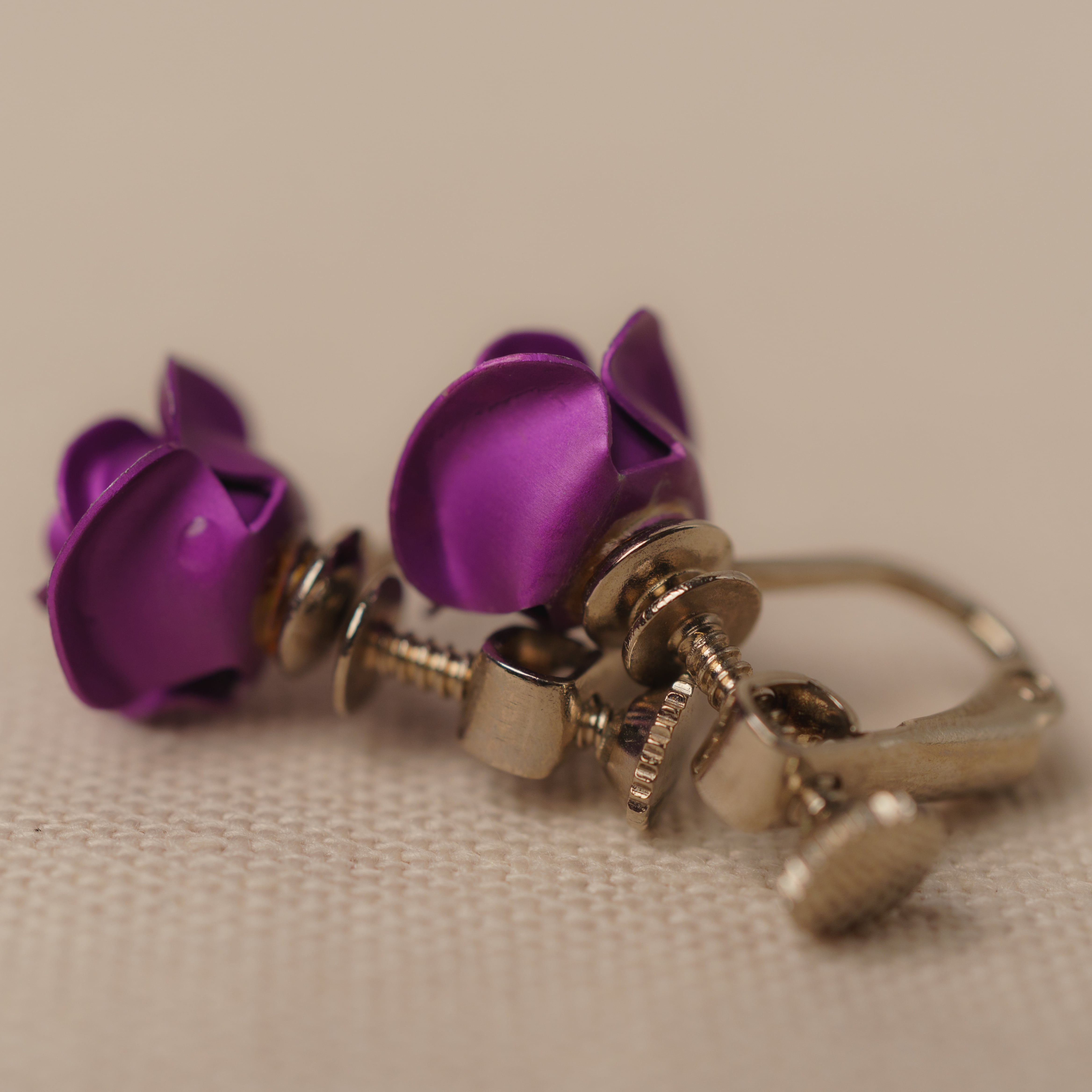 These vintage screw-back earrings feature sculpted rose buds in a bold, regal purple—an uncommon yet captivating colour that brings both sophistication and a playful twist to a classic floral motif. The roses are finely shaped, their petals curling inwards with an almost origami-like precision, adding sculptural depth to their petite size.