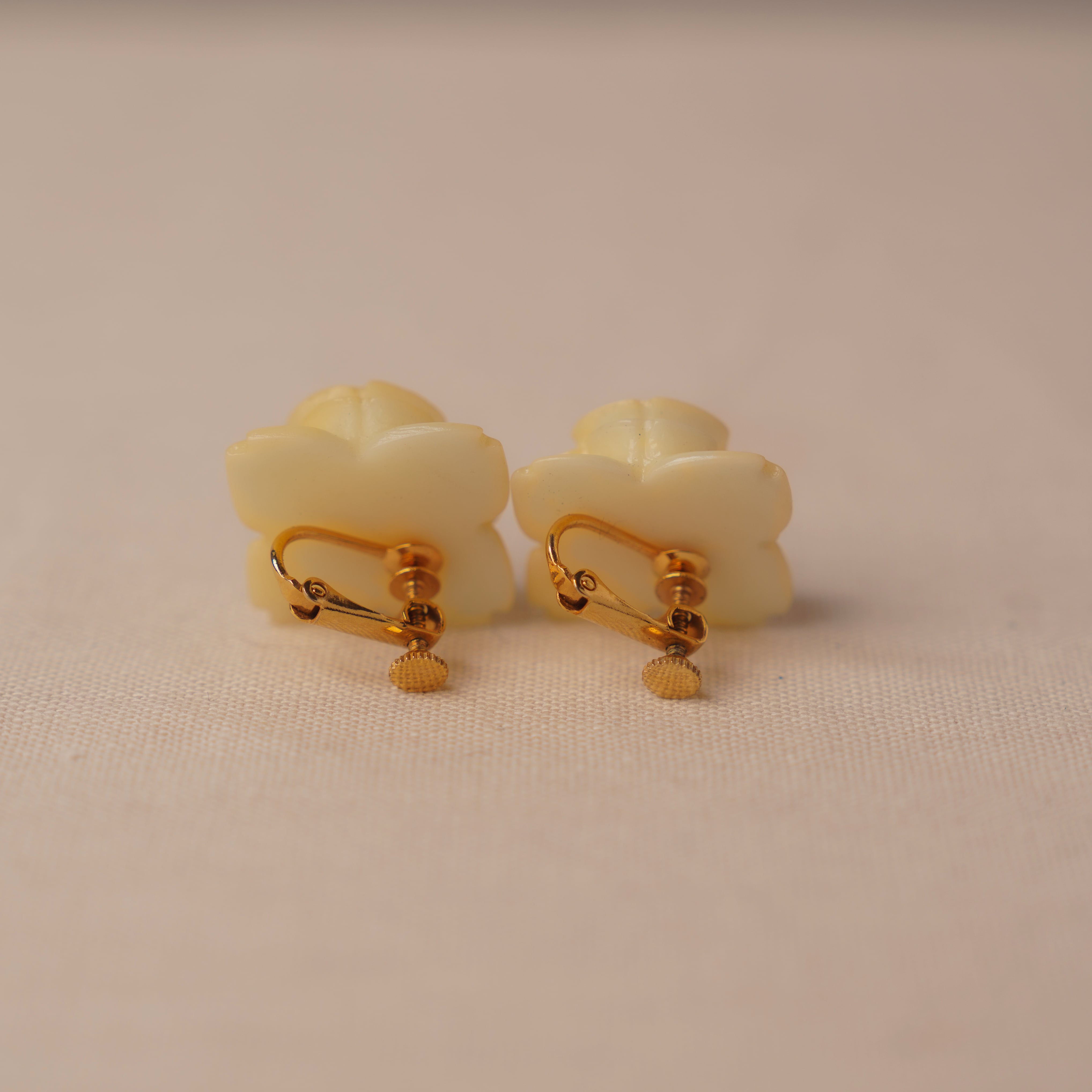 ルーサイト特有の軽やかさと艶感が、花のやわらかさを表現しながらも、しっかりとした存在感を保ってくれるのが魅力。明るくも控えめなレモンイエローは、まるで陽の光をまとったような穏やかな彩りで、顔まわりに明るさと軽やかさを添えてくれます。ねじ式のイヤリングは、快適なつけ心地と安心感のあるフィット感が特長です。