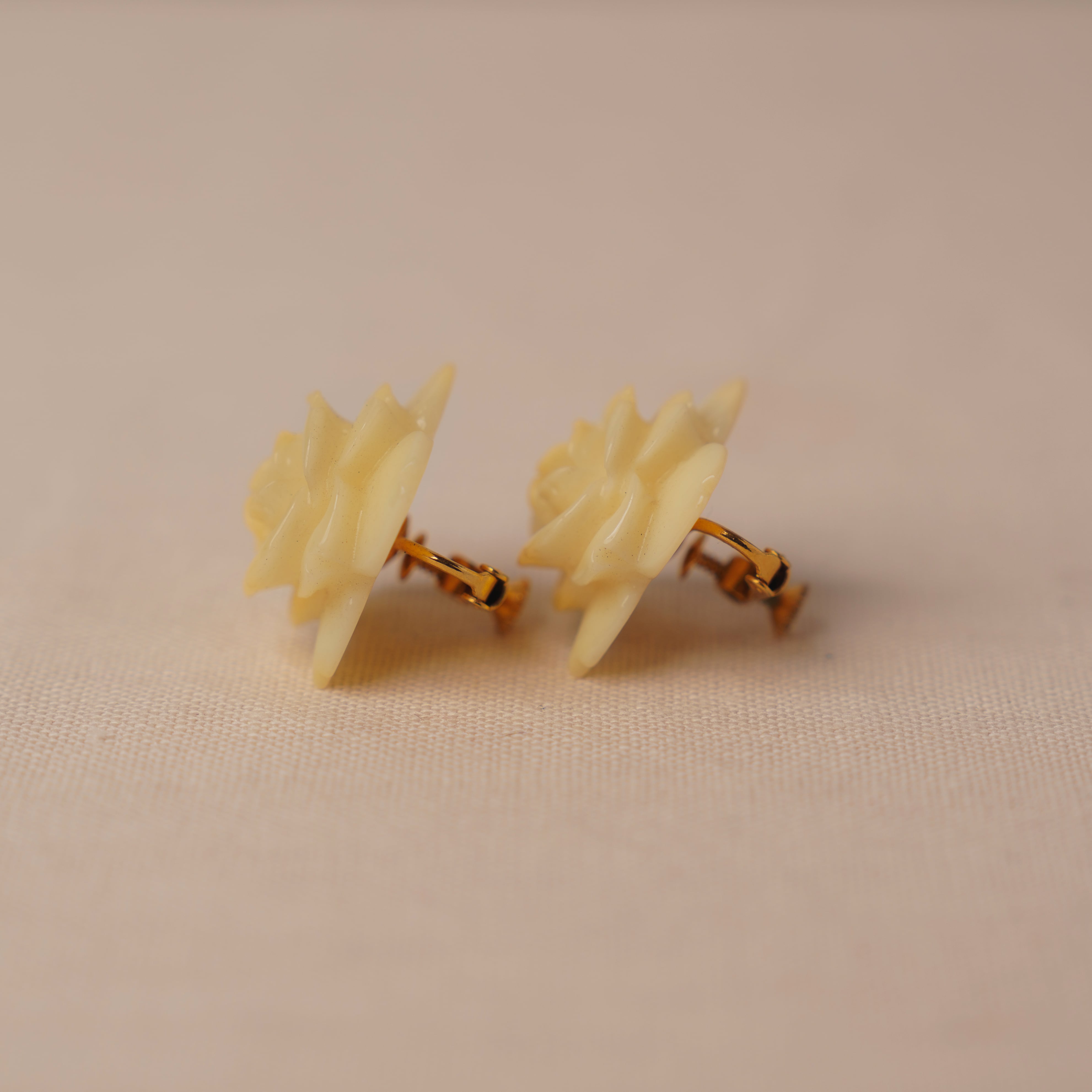 やさしいレモンイエローが愛らしい、ヴィンテージのローズモチーフイヤリング。素材にはミッドセンチュリー期のコスチュームジュエリーで人気を博したルーサイトが使われており、一点一点手彫りで仕上げられた花びらの立体感が、美しく繊細な印象を与えます。