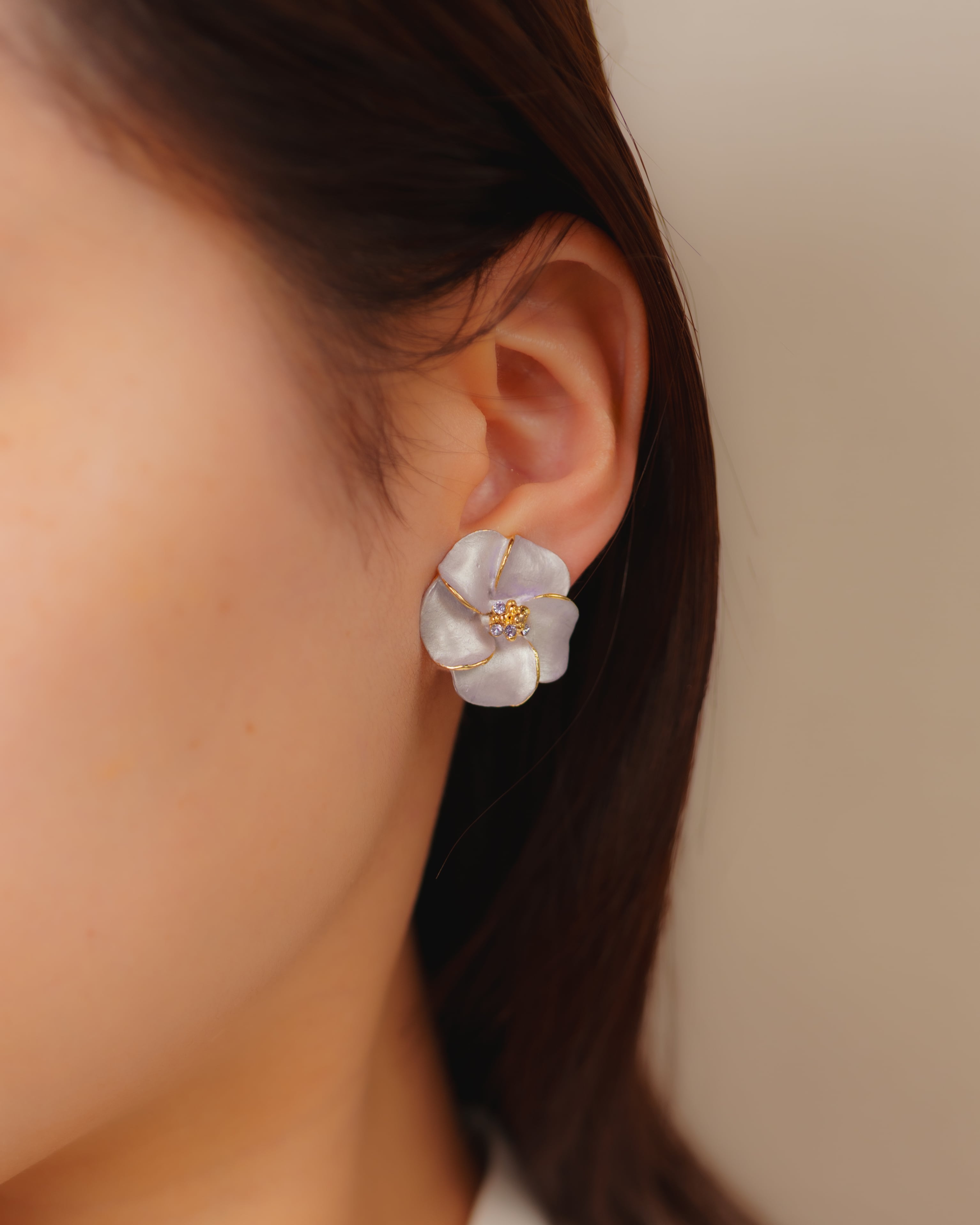 春夏はシフォンブラウスやヴィンテージの花柄ドレスに合わせて、涼やかで華やかな印象に。秋冬には、ニットやウール素材にやわらかな光を添えてくれます。季節を問わず、上品なロマンティシズムを耳元に添える一点です。