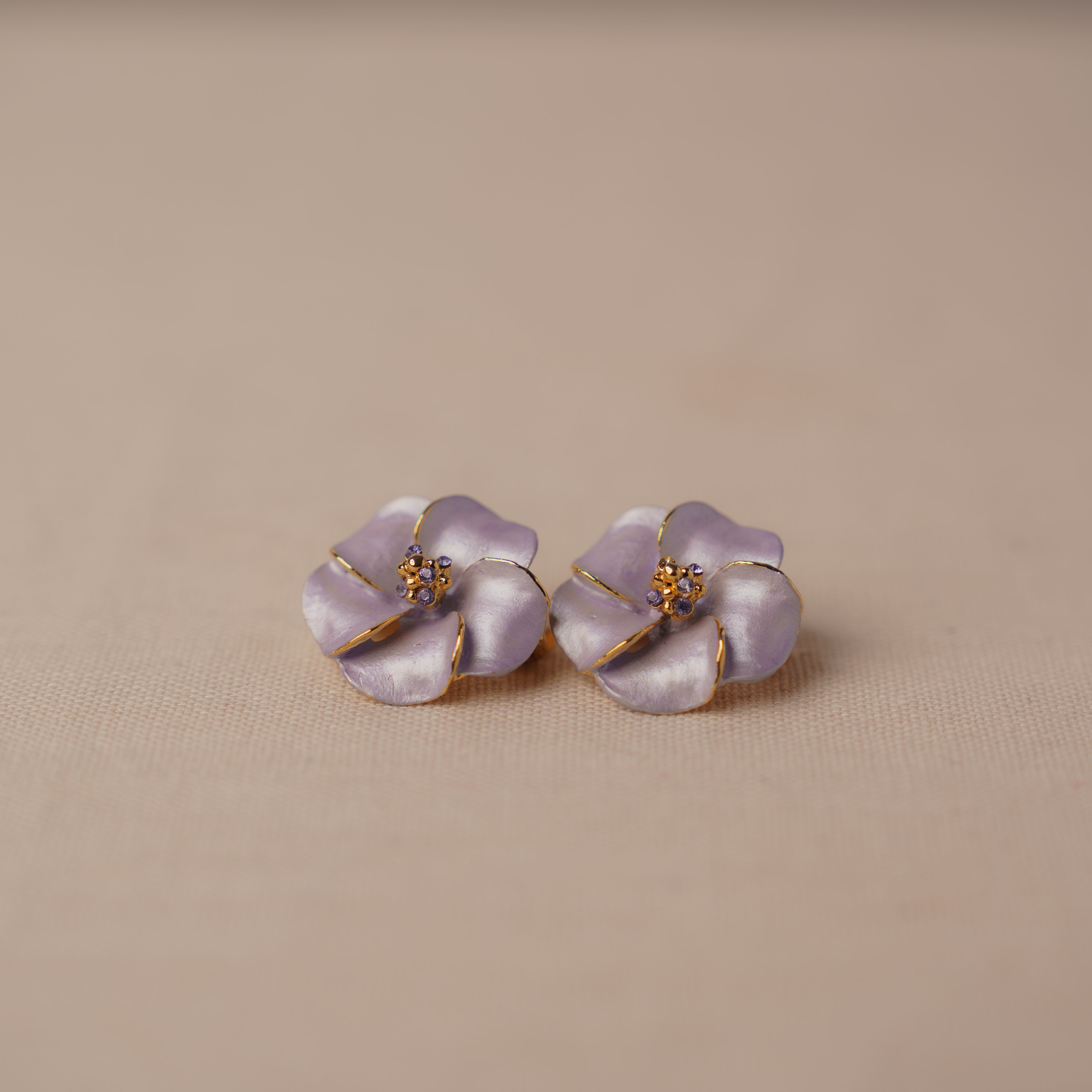 やわらかな花びらの曲線と淡いライラックの光沢が印象的な、ヴィンテージのフラワーモチーフイヤリング。1950年代のコスチュームジュエリーを思わせるロマンティックな佇まいで、サテンのような質感のエナメルで彩られた花びらが、繊細なゴールドトーンの縁取りによって上品に引き立てられています。中央には小さなラインストーンがさりげなく配置され、控えめなきらめきを添えます。