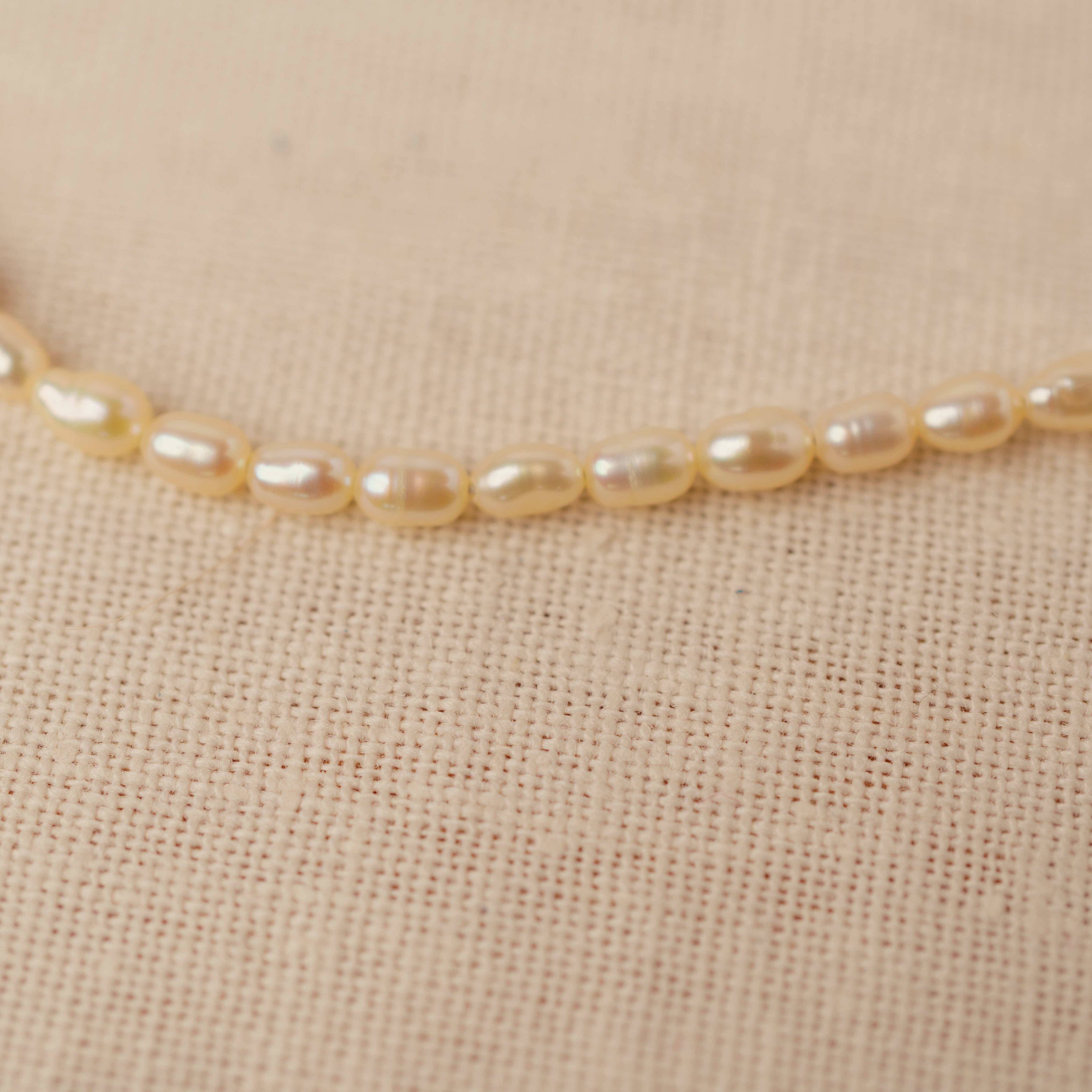 やわらかな光沢と控えめな品の良さが魅力の、フレッシュウォーターパールを用いたヴィンテージネックレス。うっすらとピンクがかったニュアンスのあるパールは、表面もなめらかで、形やサイズも比較的一定しており、首元にしなやかで美しいラインを描きます。