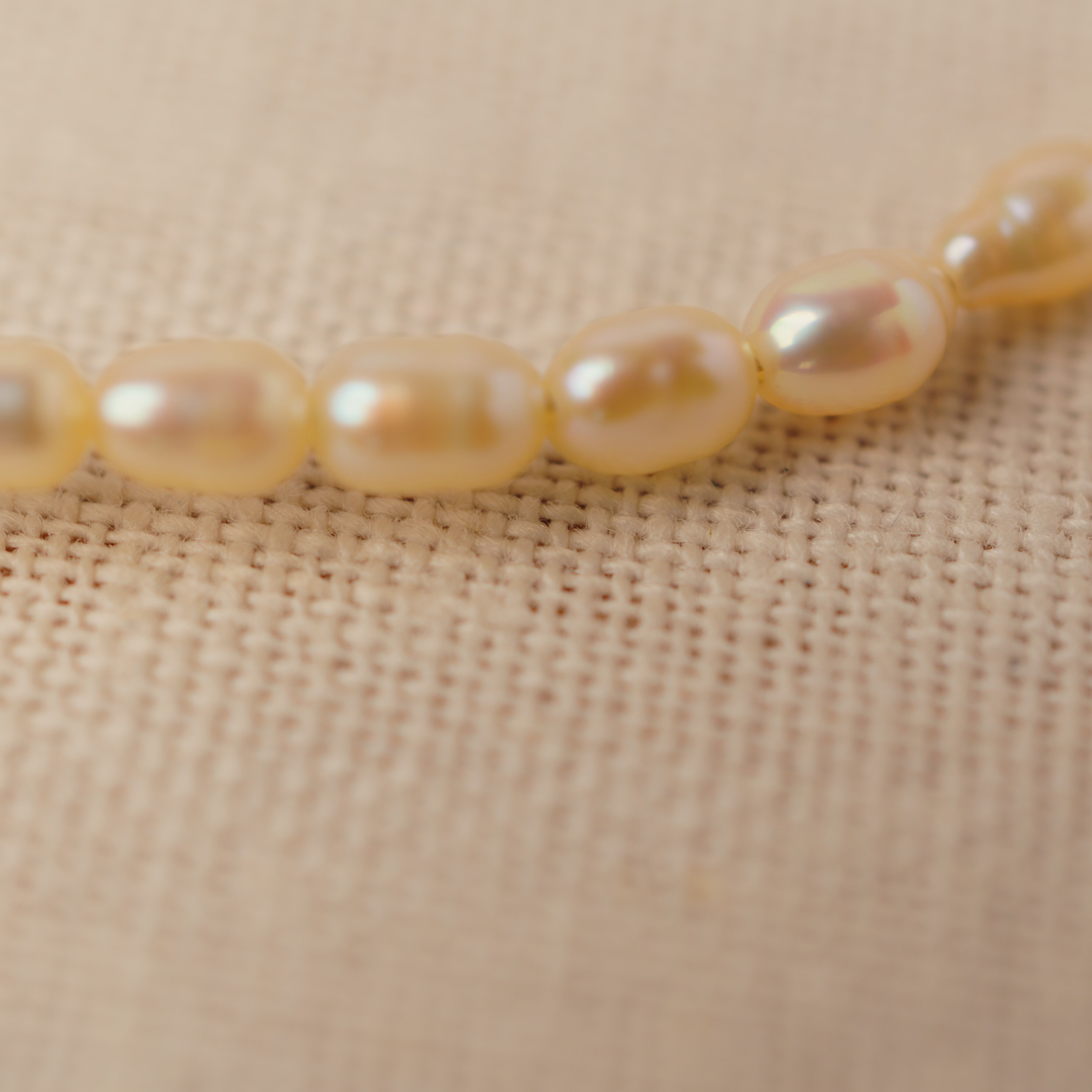 1990年代後半から2000年代初頭にかけてのものと思われ、時代を超えて愛される真珠の美しさに、当時のミニマルなエレガンスが重なり合うデザインです。細長い楕円形のパールが連なり、淡く柔らかな艶にほのかなローズカラーが浮かび、肌に溶け込むように馴染みます。シルバートーンのクラスプとアジャスター付きで、スタイリングに合わせて長さを調節可能です。