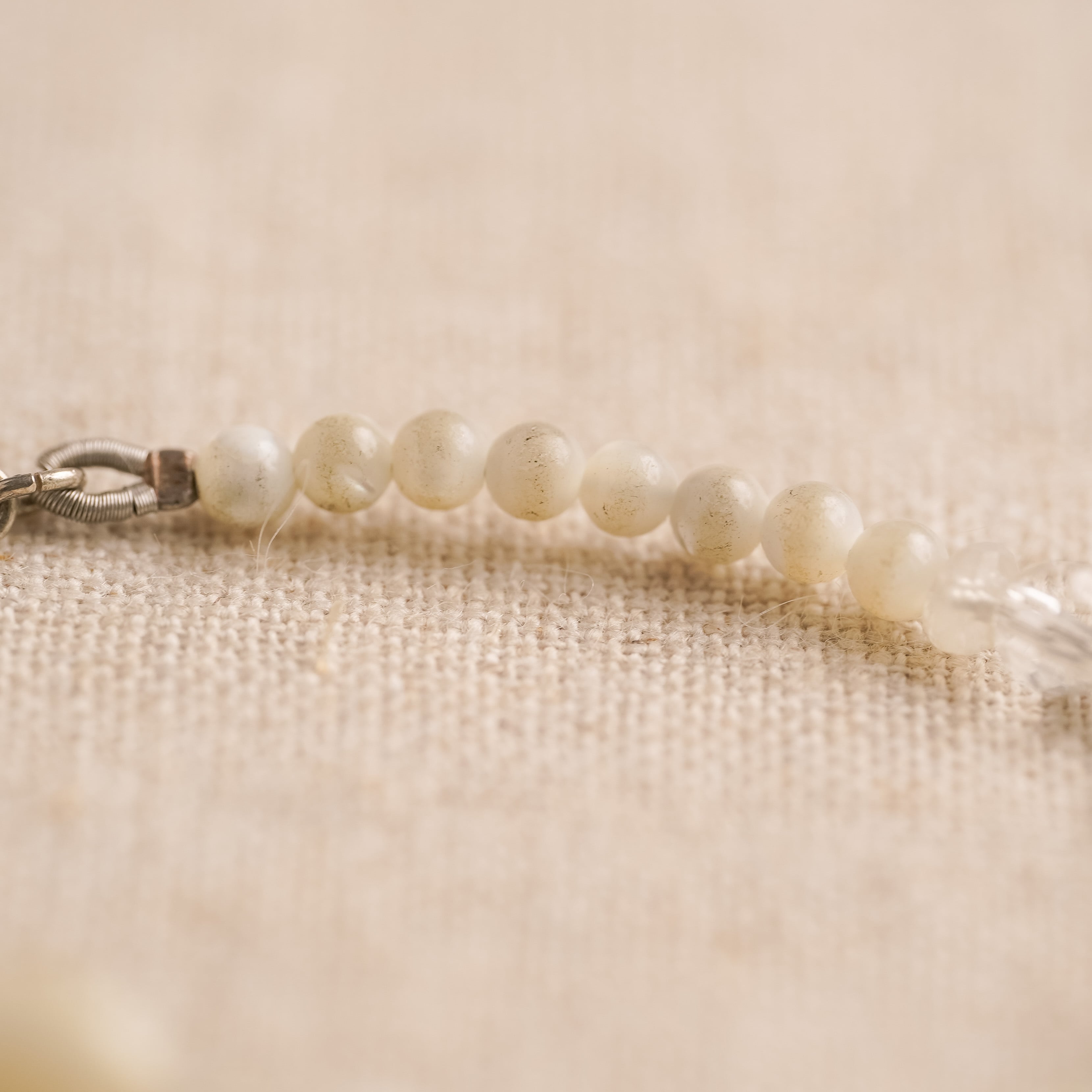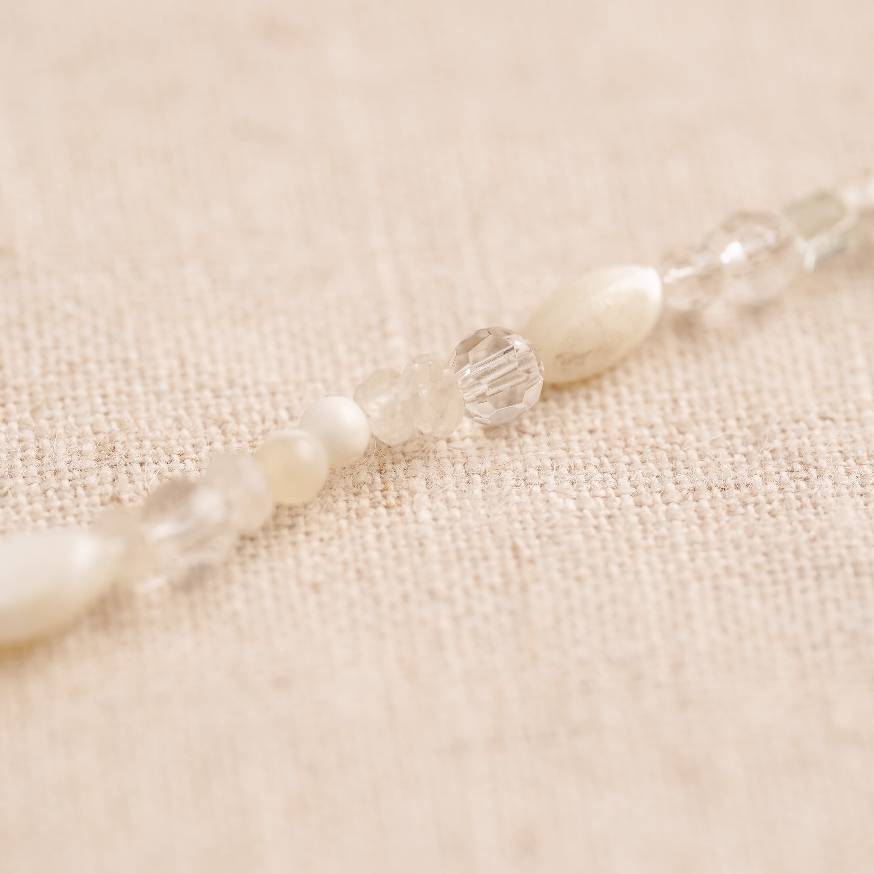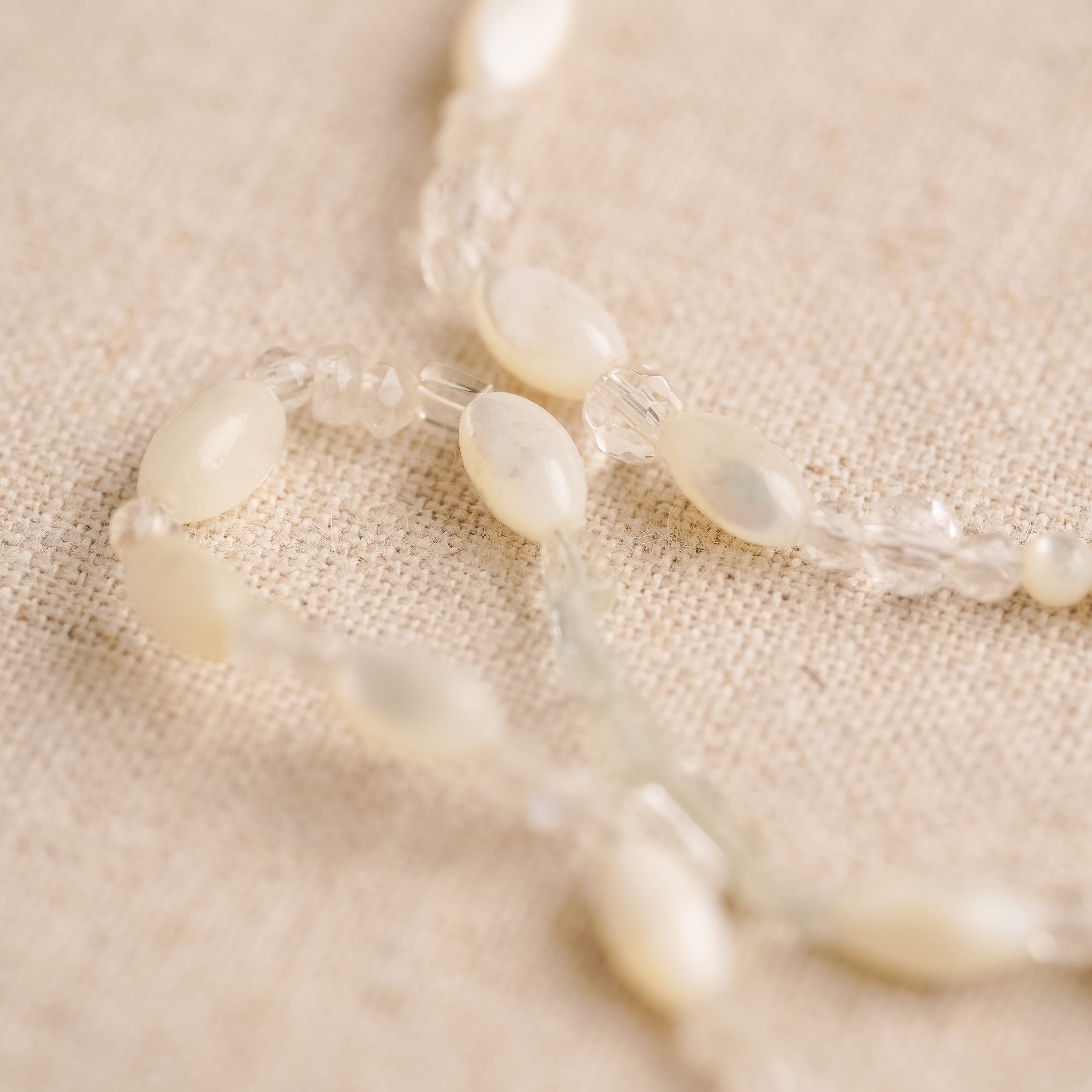 This vintage necklace is a gentle interplay of freshwater pearls and clear-cut beads, combining the creamy translucence of natural pearls with the crisp clarity of glass-like accents. The result is a piece that feels like an ocean spray suspended in motion—light, tonal, and filled with airiness. The pearls provide softness and grounding, while the clear beads lend a sense of rhythm and sparkle, creating a fresh, dance-like feel with every turn.