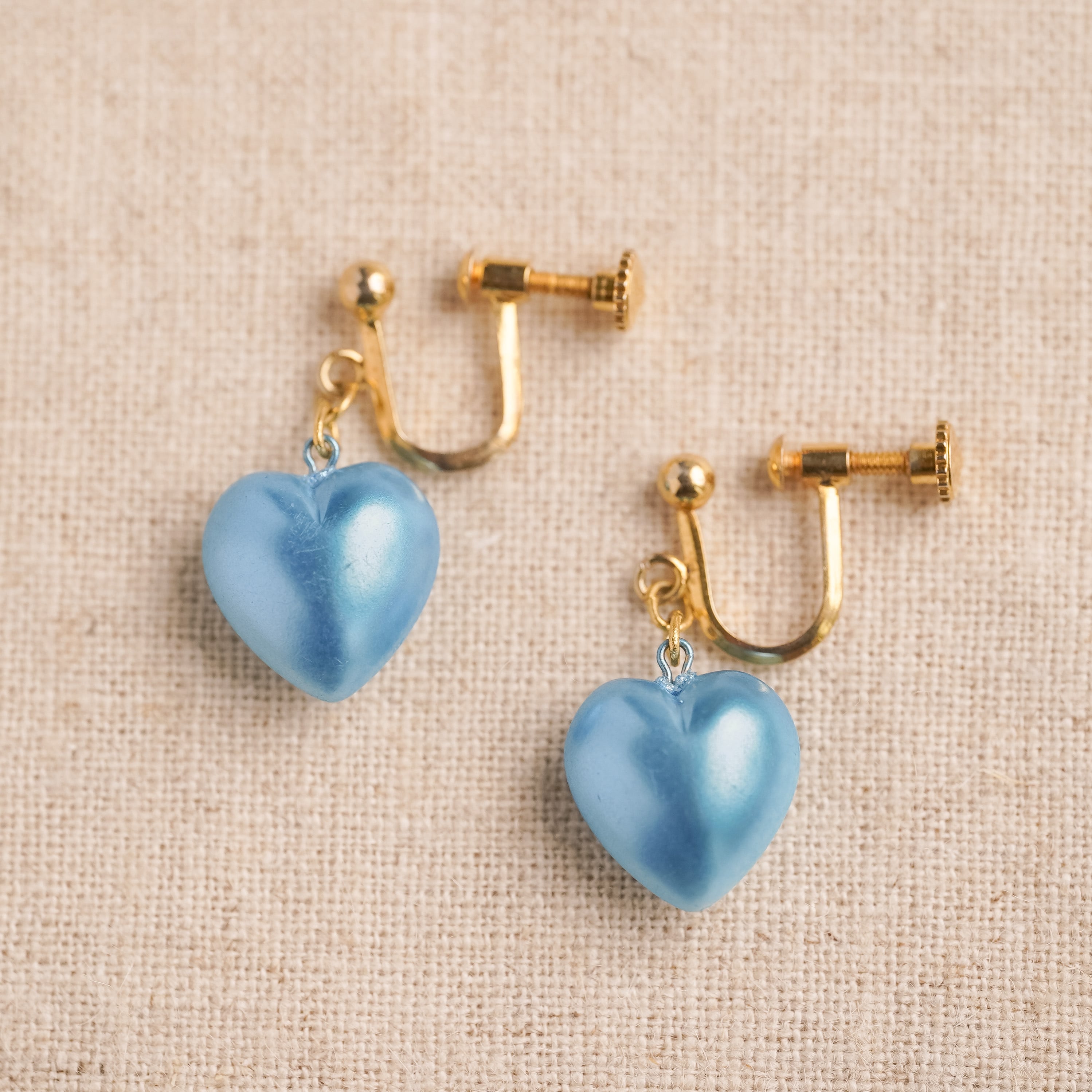 ぷっくりとしたフォルムが愛らしい、メタリックブルーのハートチャームが揺れるヴィンテージイヤリング。優しく丸みを帯びたシルエットに、ゴールドの金具を合わせたデザインは、まるで地中海のリゾート地を思わせるような、洗練された遊び心を感じさせてくれます。揺れるたびにさりげなく光を反射する質感が、顔まわりにやわらかなきらめきを添えてくれます。