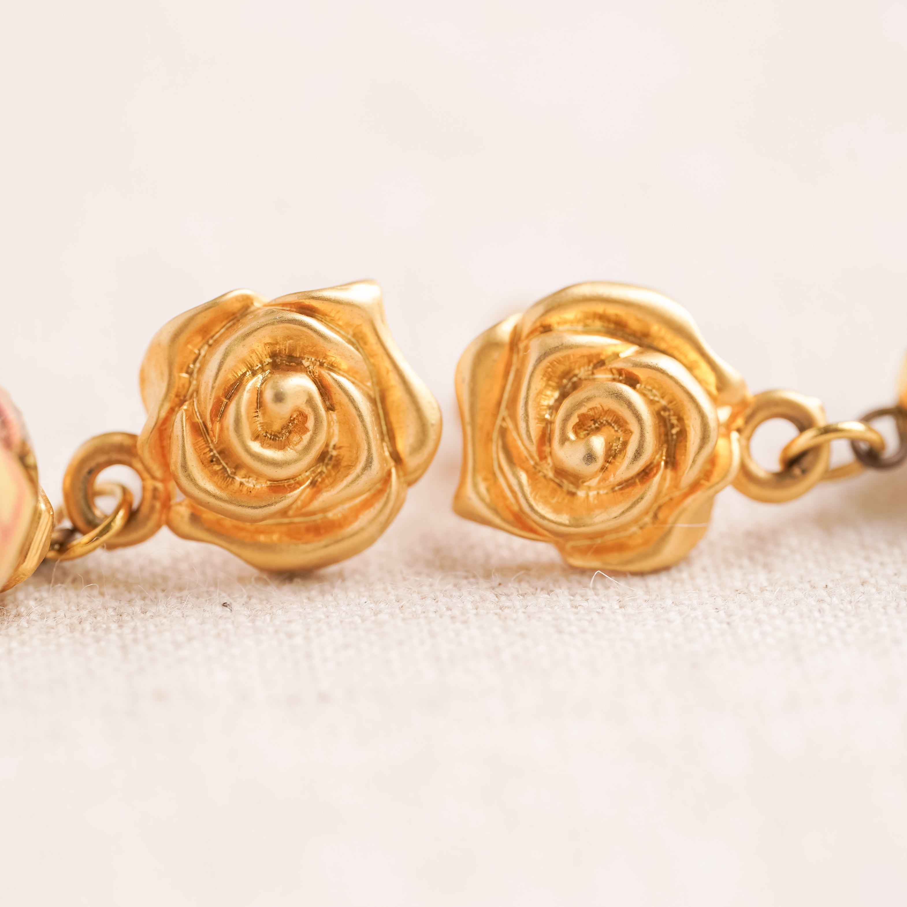 These exquisite vintage earrings feature an elegant combination of gold-toned rose charms and hand-painted ceramic baubles. The ceramic drops are adorned with delicately rendered rose motifs—likely influenced by the Romantic and Pre-Raphaelite styles of the 19th century—showcasing fine detailing in the petals and a soft, romantic palette of dusty pinks and deep mauves. The result is a piece that exudes the timeless poetics of floral art, carried gently in motion with the wearer’s steps.