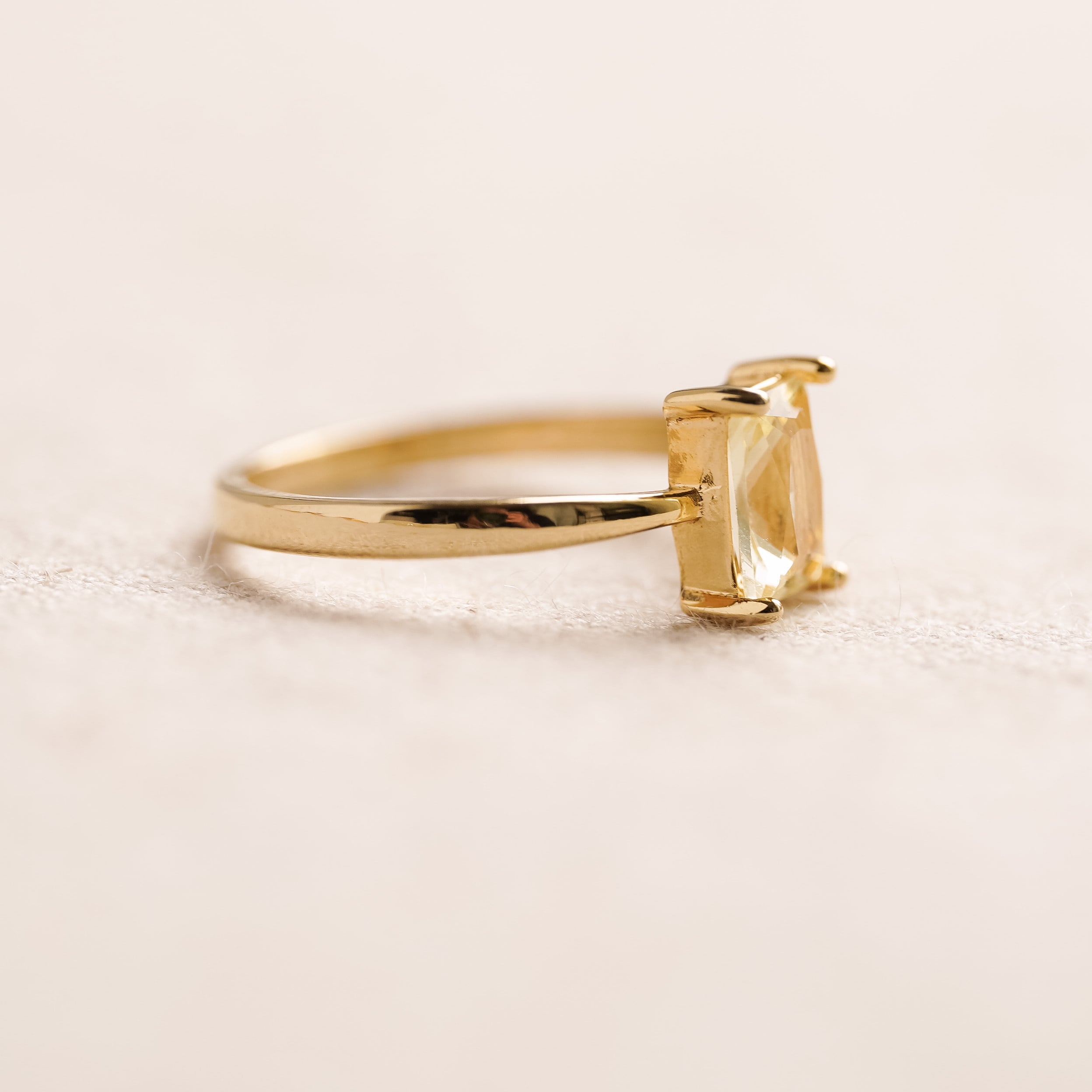 A delicate and quietly radiant vintage ring, featuring a baguette-cut clear glass stone with the faintest suggestion of lemon yellow at its core. The elongated rectangular shape, known as a baguette cut, evokes the elegance of early 20th-century jewelry while embracing a clean, architectural silhouette. The stone is held in a minimalist four-prong setting, allowing light to pass through and draw out its subtle, luminescent hue.