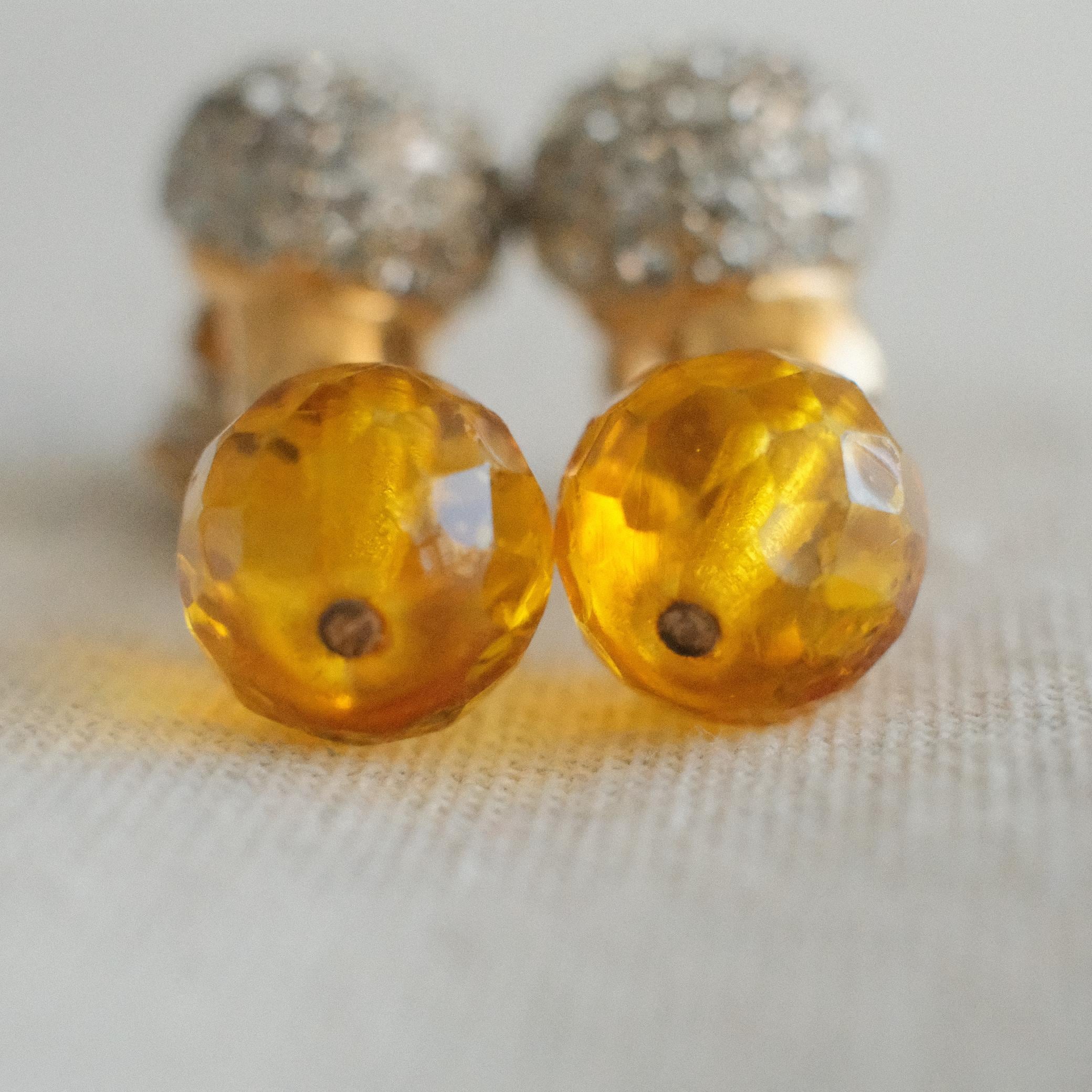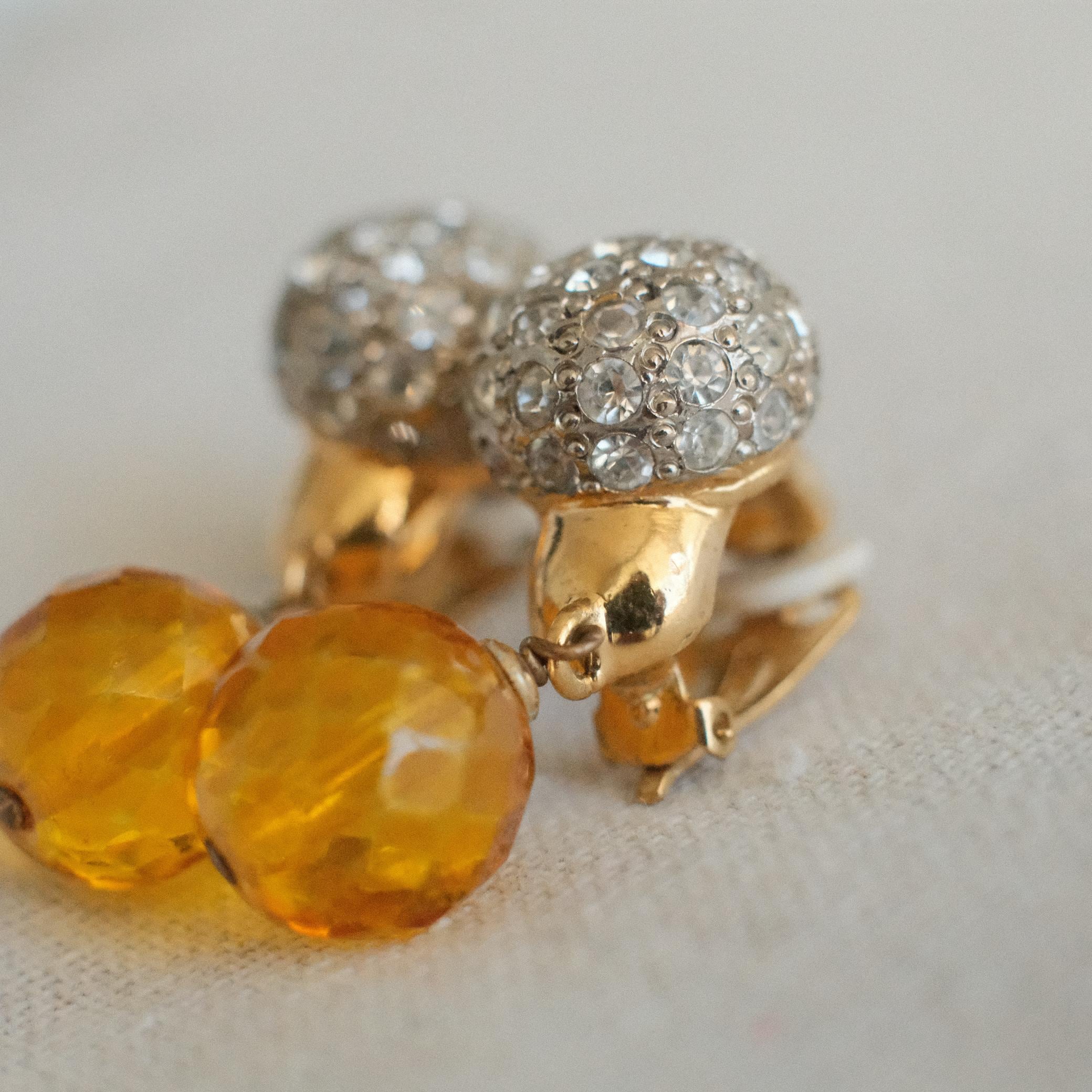 A playful yet elegant creation, these vintage clip-on earrings feature a sparkling rhinestone dome paired with a luminous amber-hued glass bauble. Both elements catch and reflect light from different angles—subtle and refined, yet unmistakably striking.
