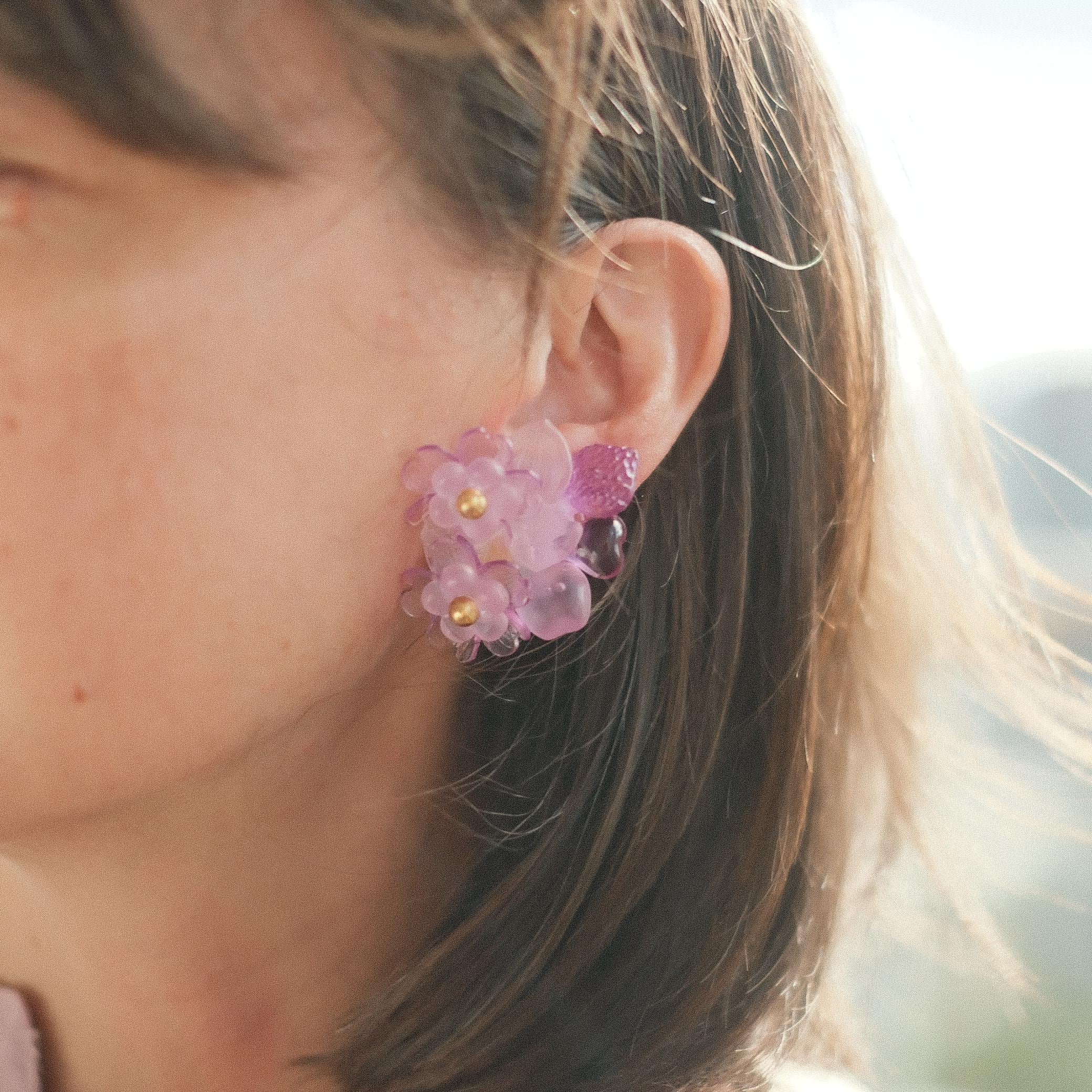 ルーサイトならではの軽やかで透明感のある質感が、花々にやさしい光を宿し、まるで朝露を纏ったブーケのように耳元を彩ります。中央にはゴールドトーンのドームが添えられ、甘すぎない上品さと立体感をプラス。少し大ぶりなサイズ感ながら、淡いパープルのトーンと半透明の質感が絶妙なバランスで、スタイリングにやわらかな印象を添えます。