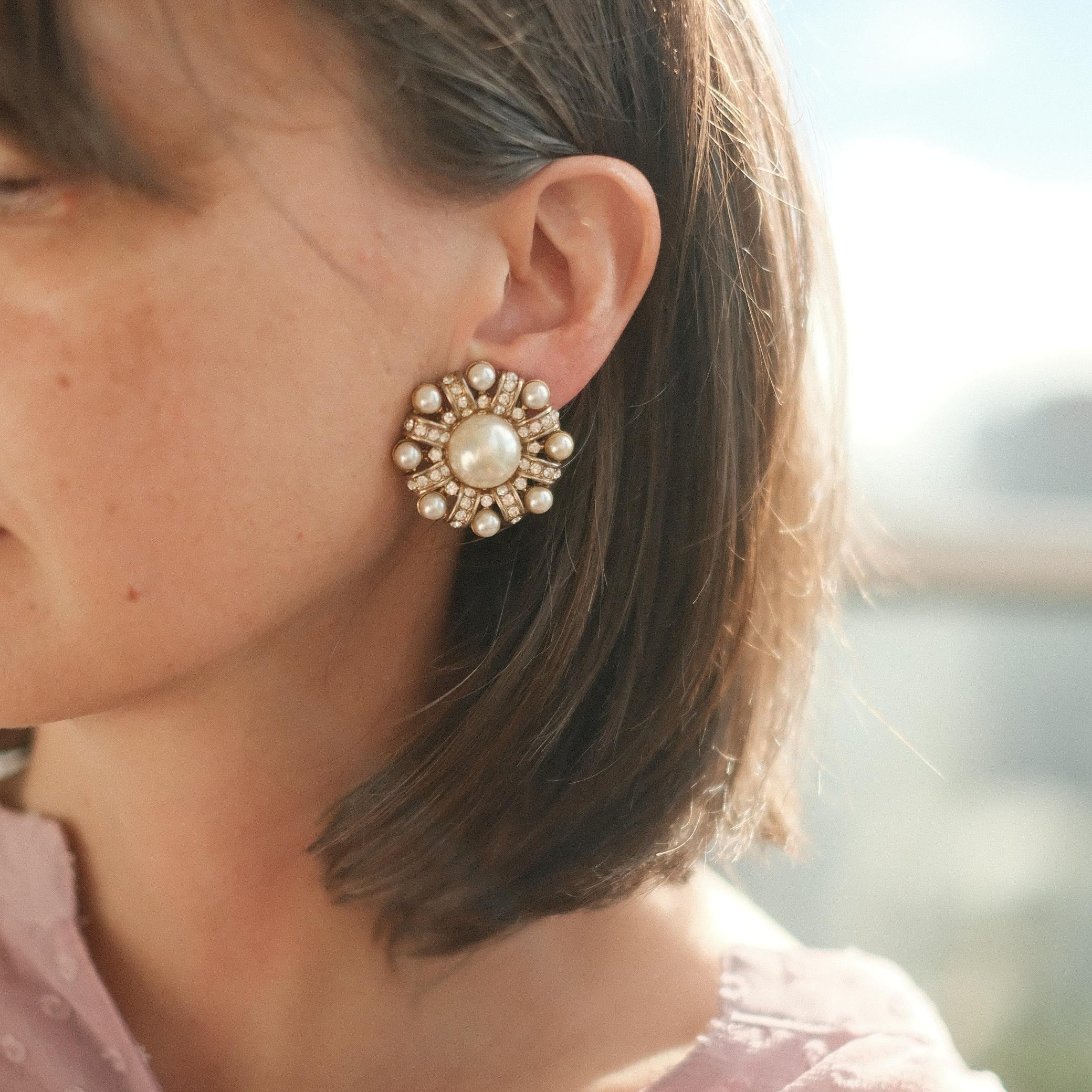 Though slightly oversized, the earrings retain a sense of softness thanks to the translucent tones of the faux pearls and the gentle sparkle of the rhinestones. The result is a piece that feels both ornate and wearable.