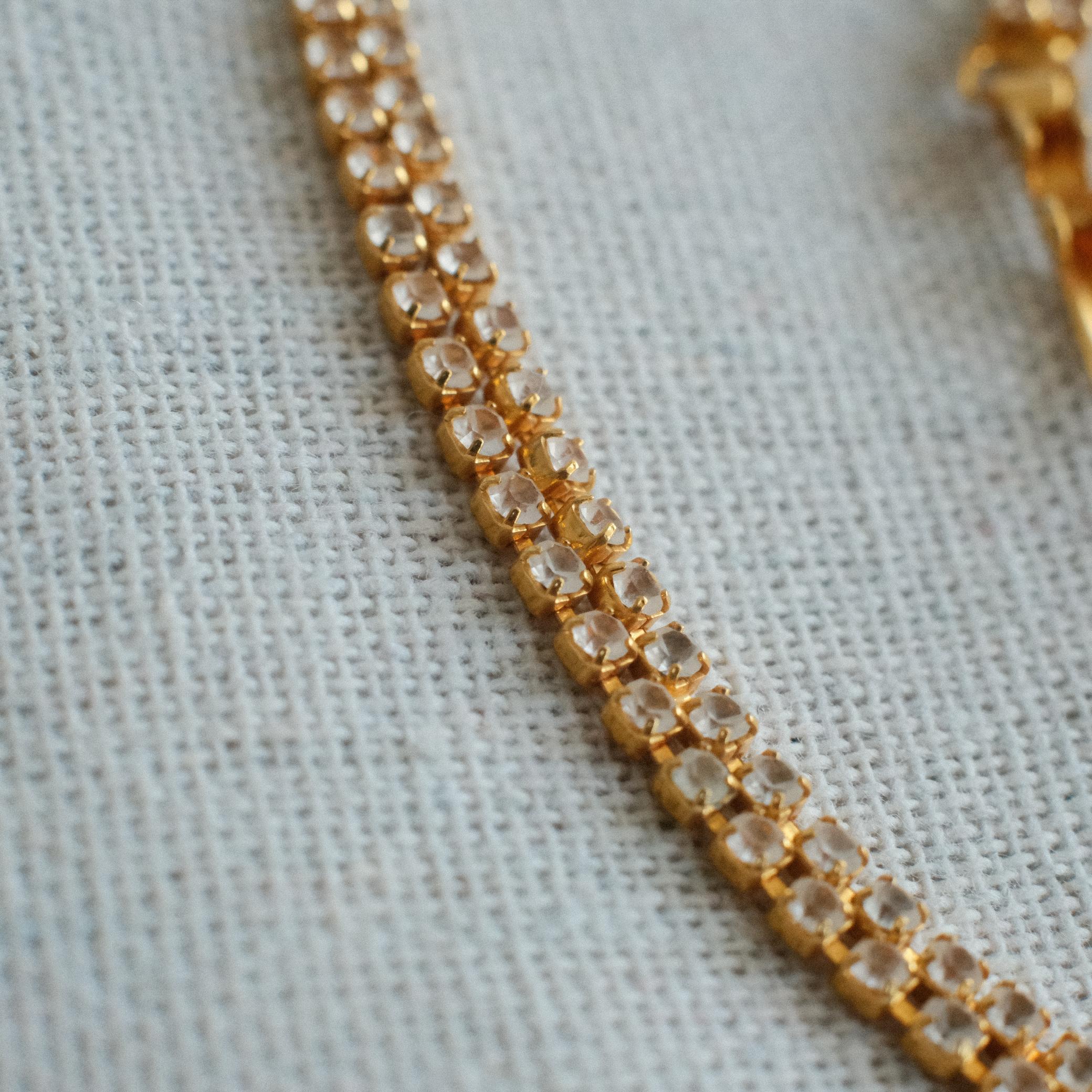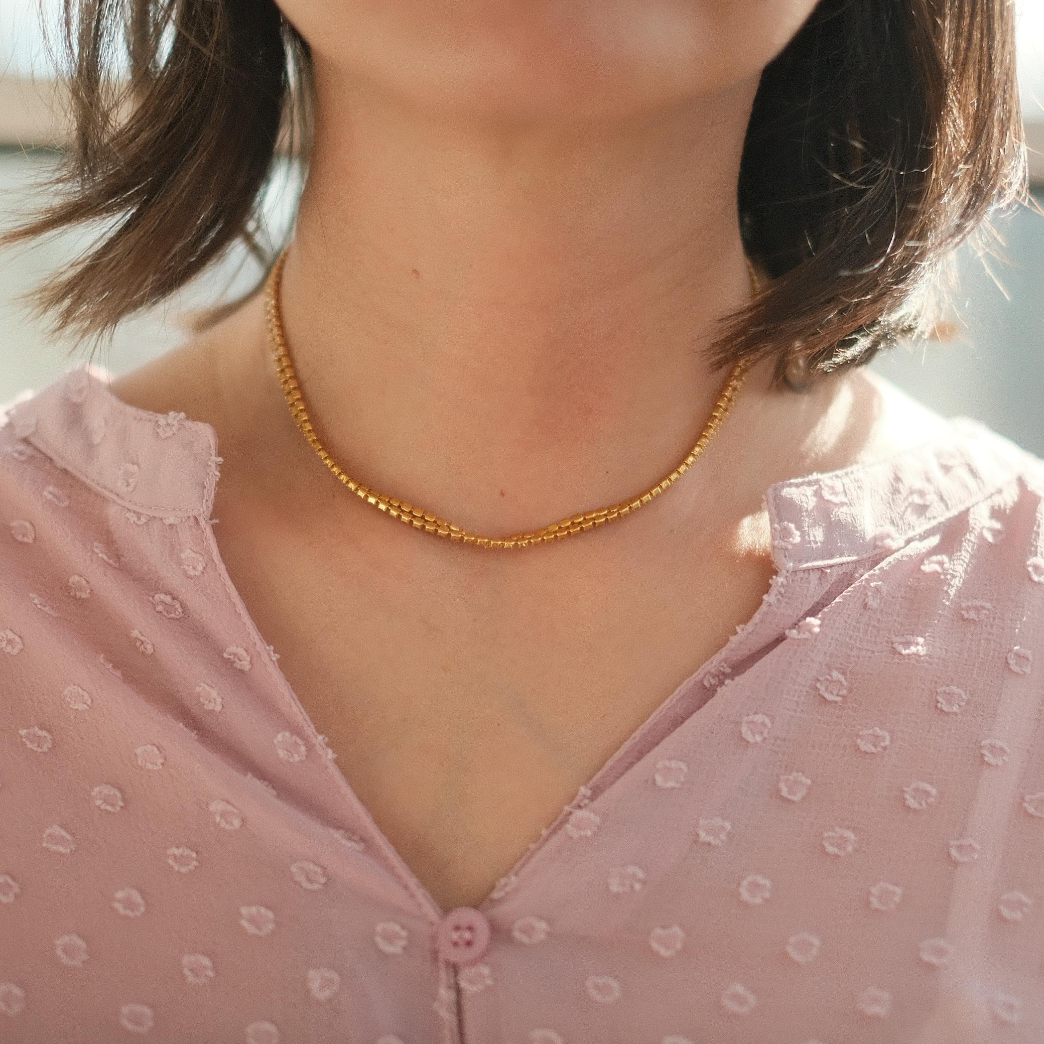 A classic vintage choker-style necklace, beautifully composed with the refined shimmer of rhinestones and the warmth of vintage gold tone. Its shorter length sits gracefully along the neckline, offering a glow that is never overwhelming but instead quietly confident. The silhouette is timeless, making it a versatile piece that seamlessly transitions from the workplace to casual lunches or evening dinners.