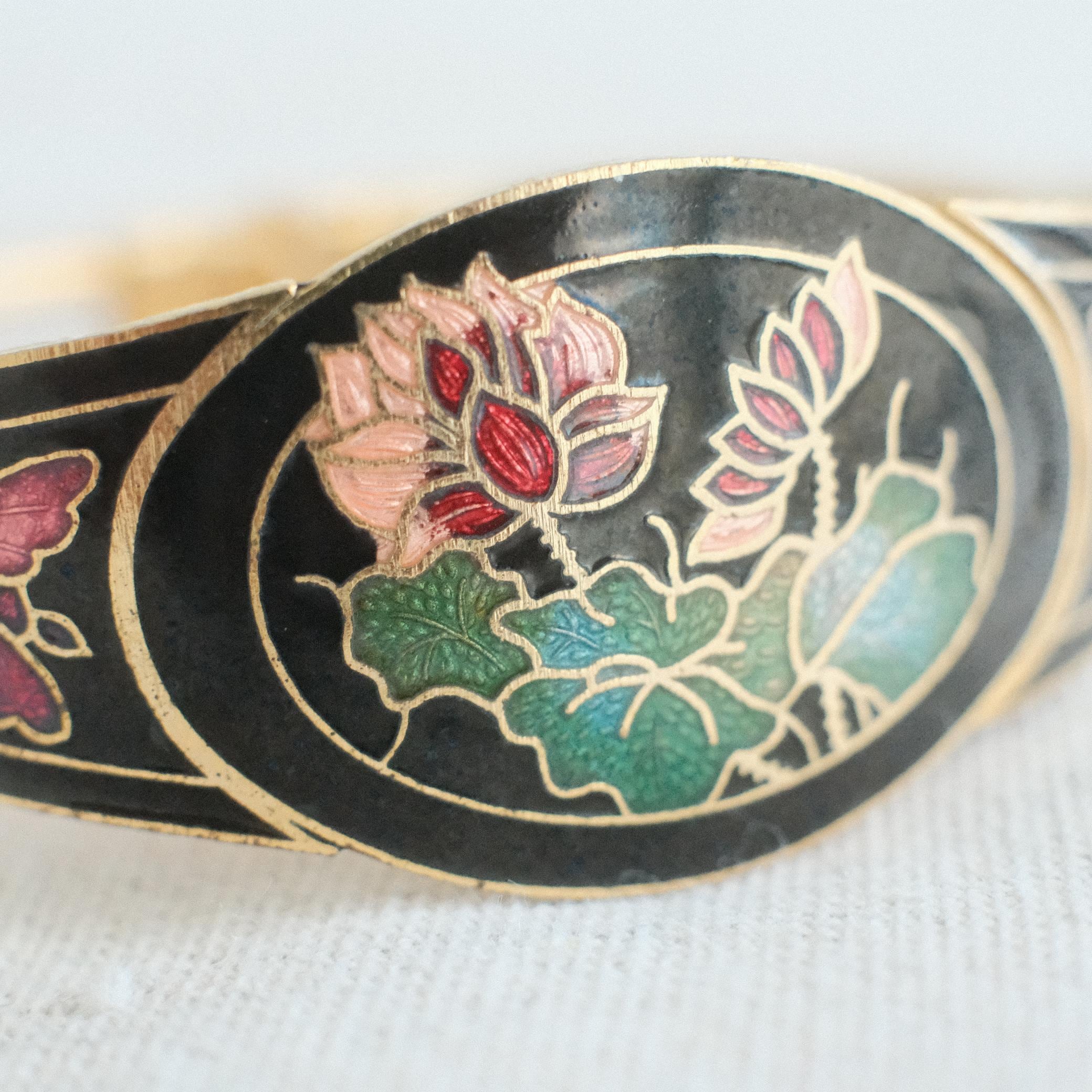 A vintage Cloisonné bangle crafted with the age-old technique of outlining designs in fine gold filaments and filling them with enamel before firing. This bangle features water lilies and butterflies set against a jet-black backdrop, evoking both stillness and vibrancy. The tone gradation applied to petals and wings shifts beautifully with the light, bringing subtle depth to the design. The black enamel highlights the motifs with striking clarity, making it both bold and elegant.