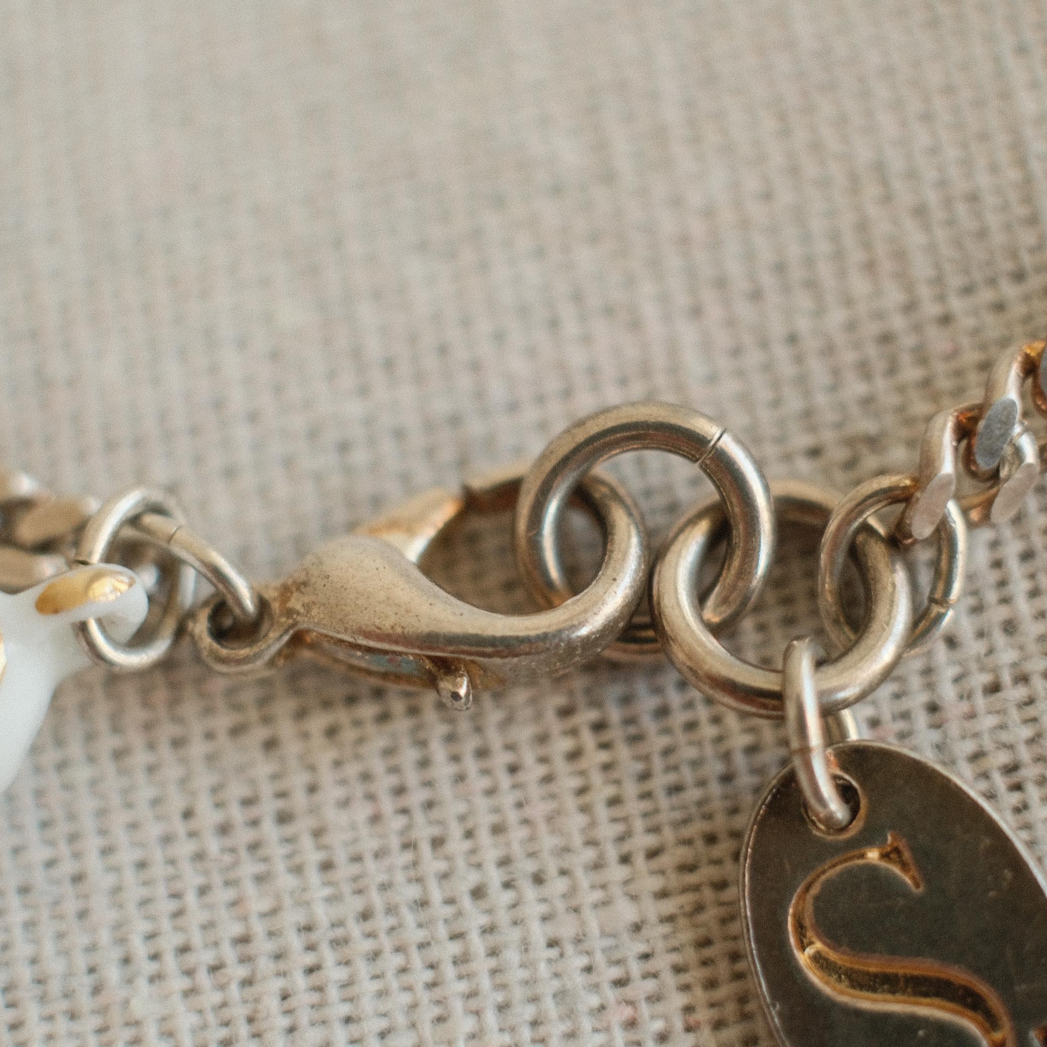 This vintage bracelet charms with a delicate ceramic teapot pendant, suspended from a simple chain with a logo accent. Its whimsical design recalls the tradition of afternoon tea and the storybook world of Alice in Wonderland, while a preserved patina enhances its vintage character.
