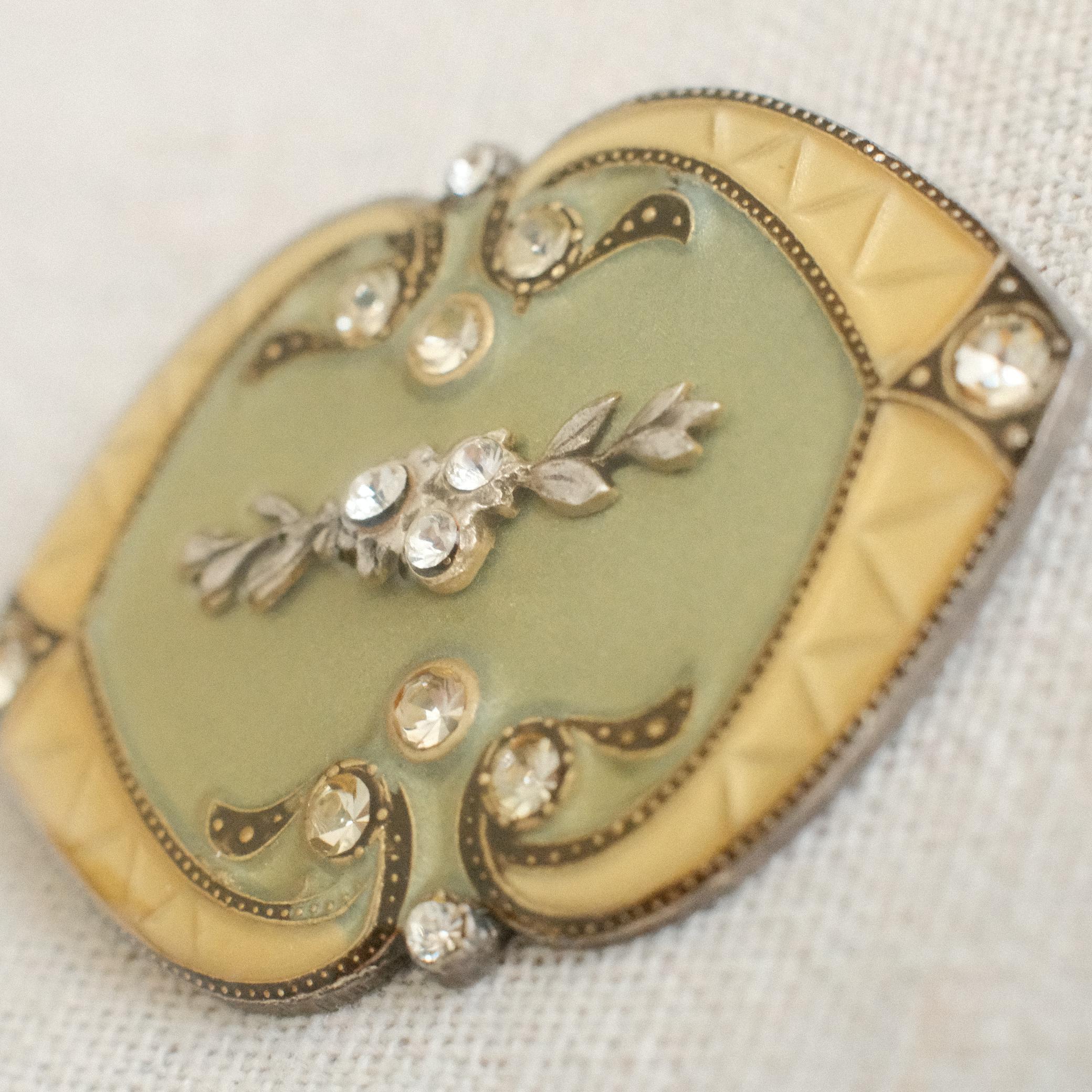 This brooch exemplifies that spirit with its symmetrical Art Nouveau-inspired design — a delicate interplay of abstract flourishes and organic motifs. At the centre, a small botanical sprig blooms in relief, framed by golden accents and ornamental scrollwork. The softly glowing enamel in pistachio and chartreuse hues creates a luminous backdrop, contrasted by the gentle sparkle of clear rhinestones delicately placed within the curves.