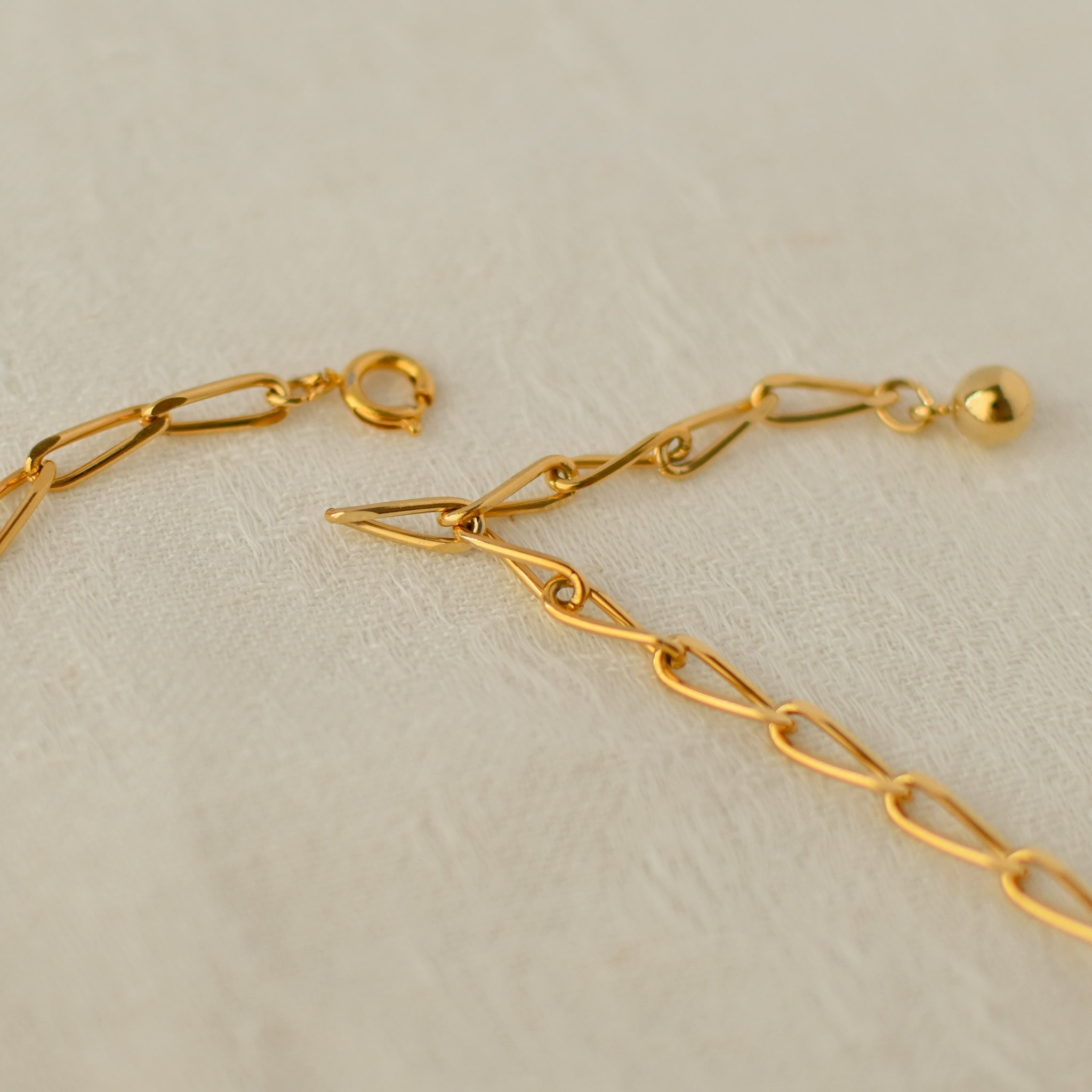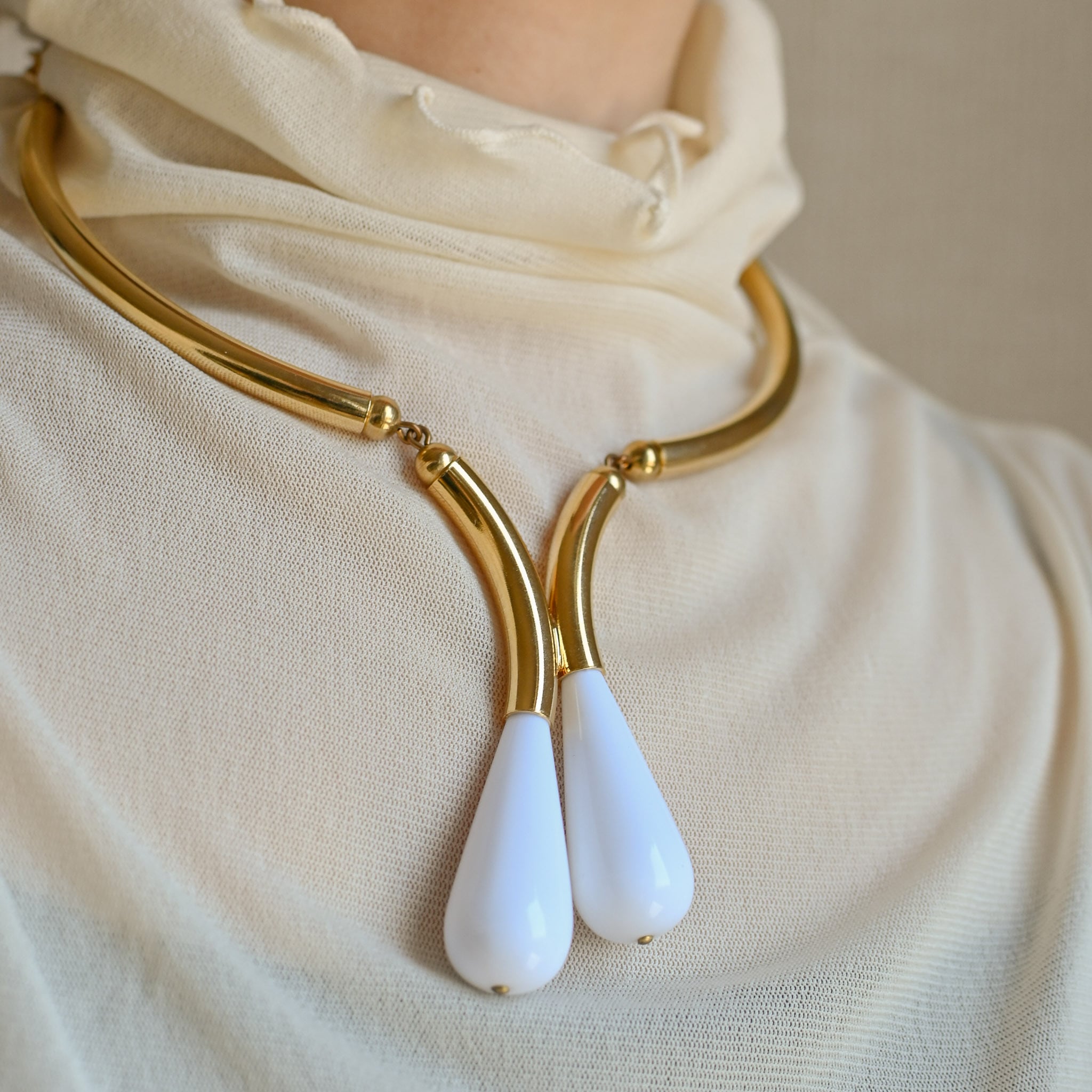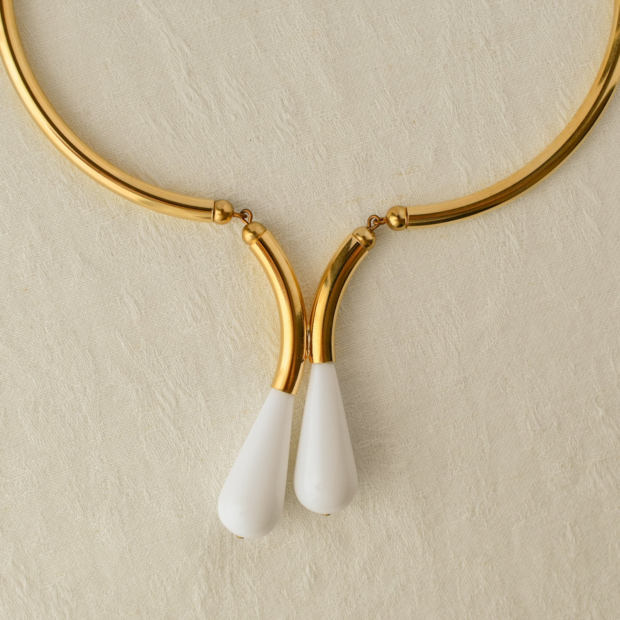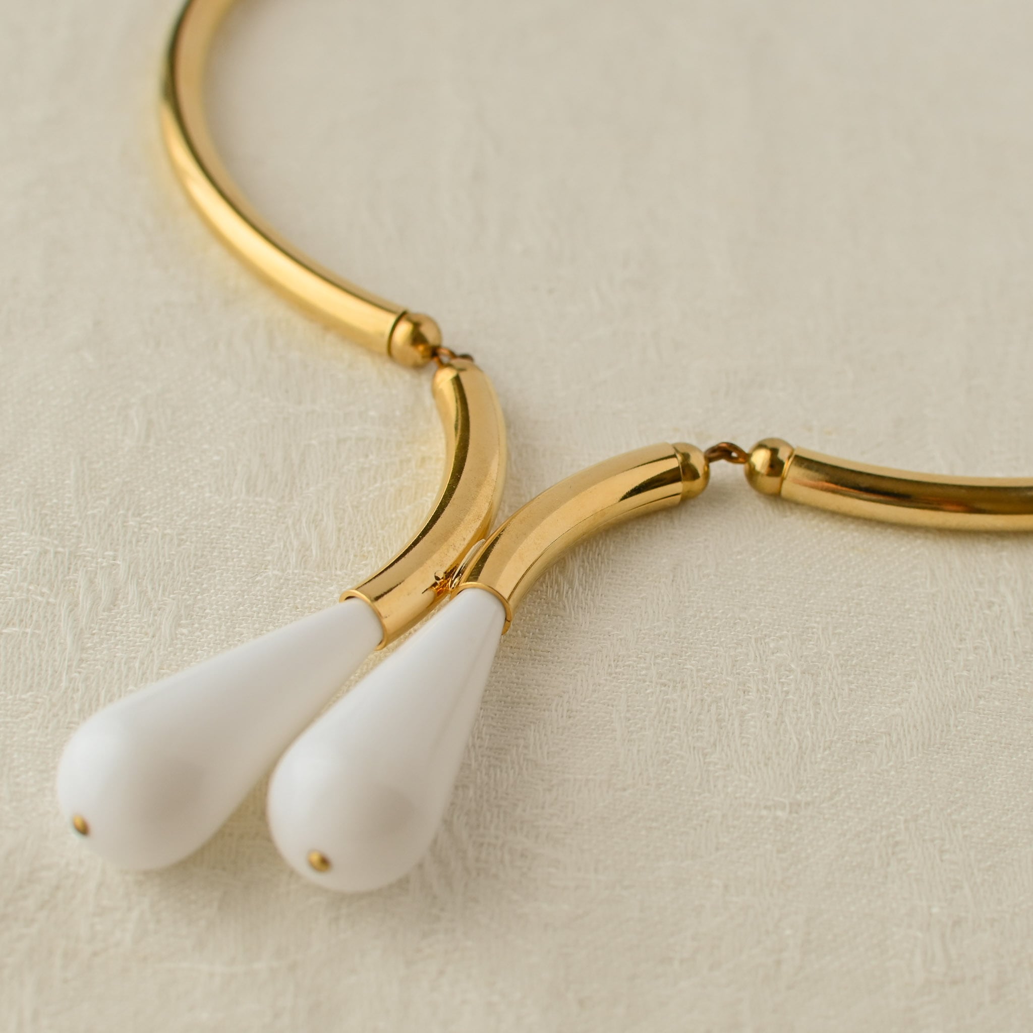 With a graceful asymmetric curve and twin teardrop charms in matte white, this vintage necklace offers sculptural elegance with a cosmopolitan edge. The contrast between the silky gold tone and the soft matte white brings depth and modernity, while the clean lines and off-centre balance create visual intrigue.