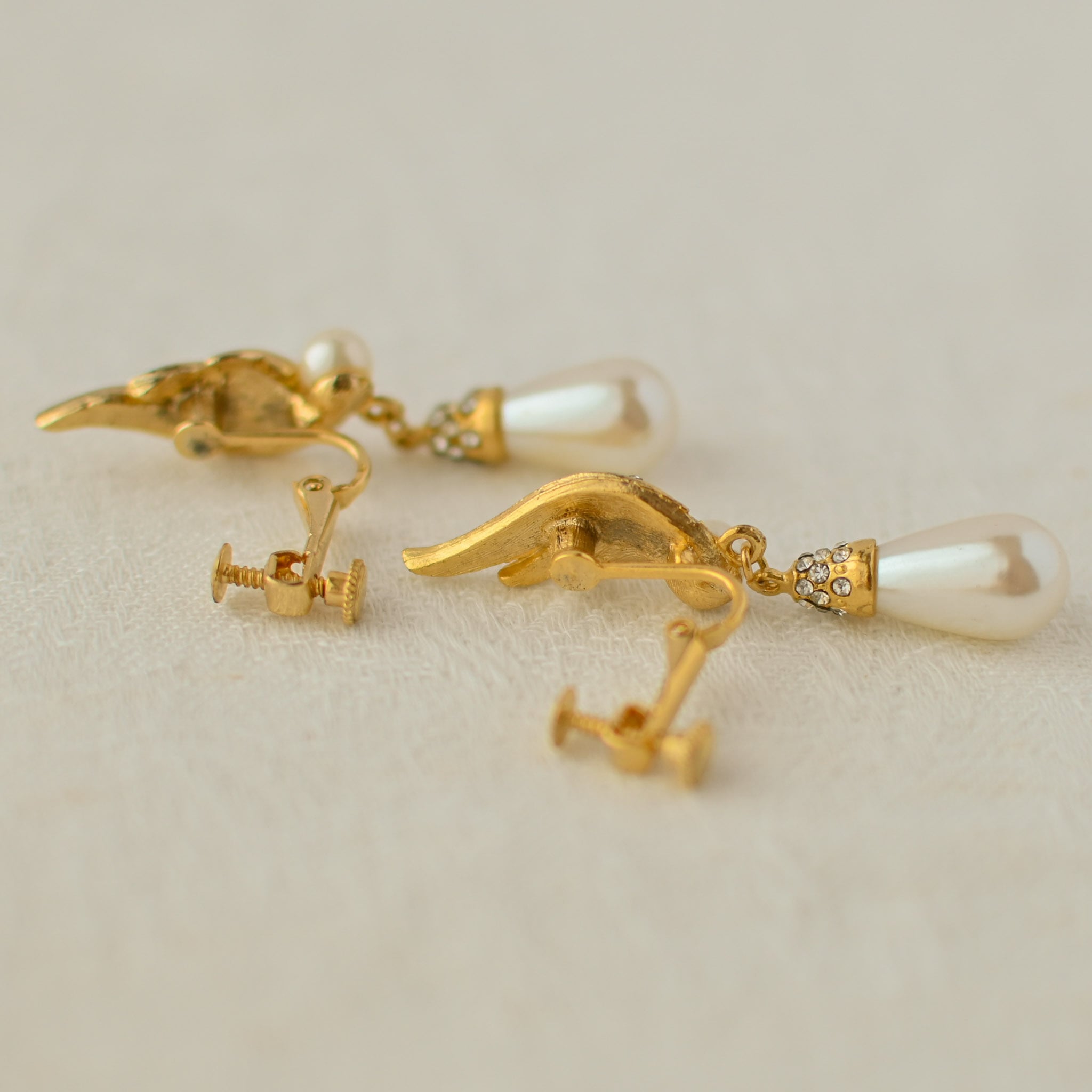 Crafted in rich vintage gold, each earring features a delicate wing motif studded with fine rhinestones and finished with a softly glowing teardrop costume pearl. The pearl sways gently with movement, catching the light with every turn and adding a sense of refined drama to the look.