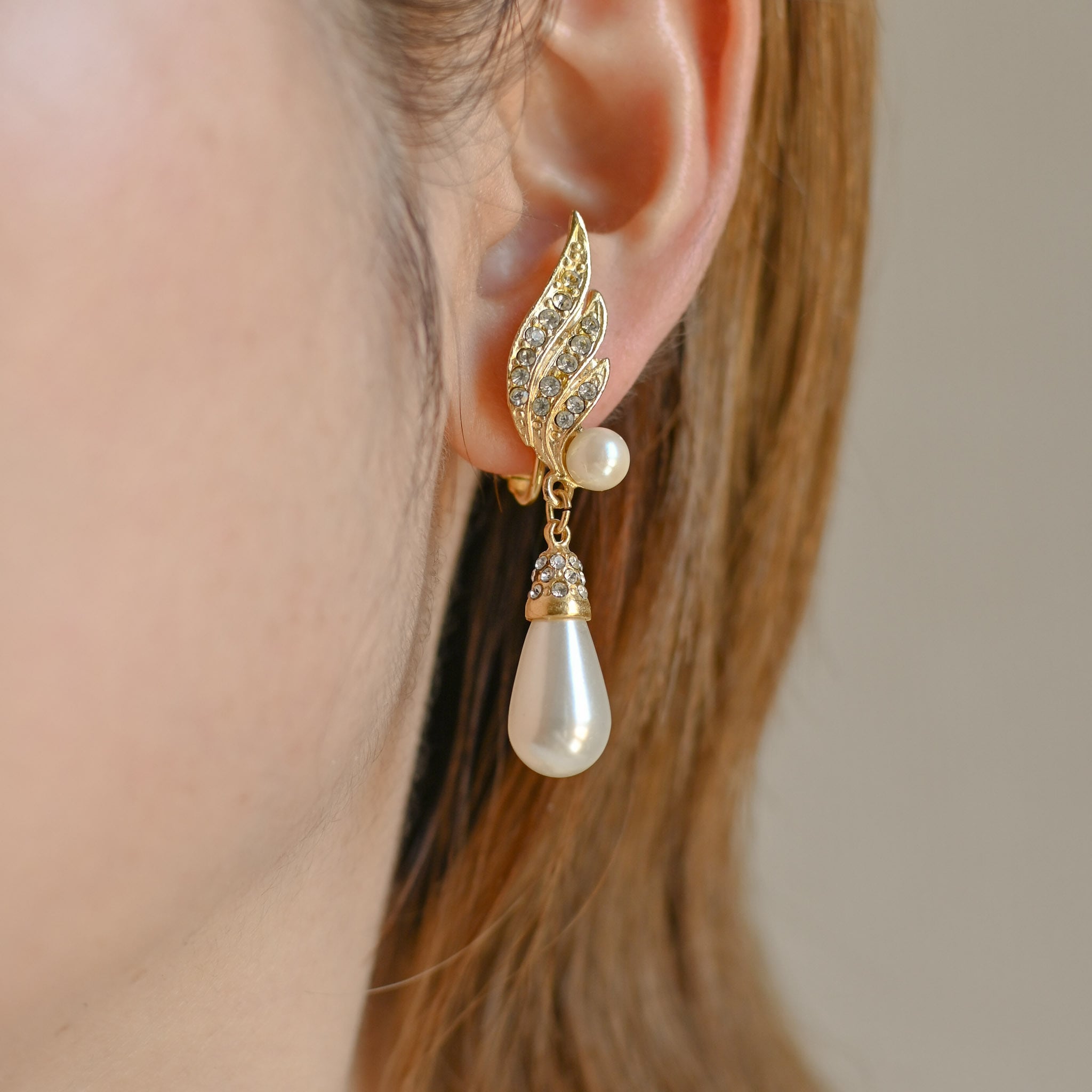 羽根のような曲線を描くゴールドのベースには、繊細なラインストーンがあしらわれ、下にはふっくらとしたコスチュームパールが一粒。動くたびにしなやかに揺れて、静かに輝きを添えてくれます。ヴィンテージゴールドの深みと、パールの優しい透け感が絶妙なコントラストを生み、気品と遊び心を同時に感じさせる仕上がりに。