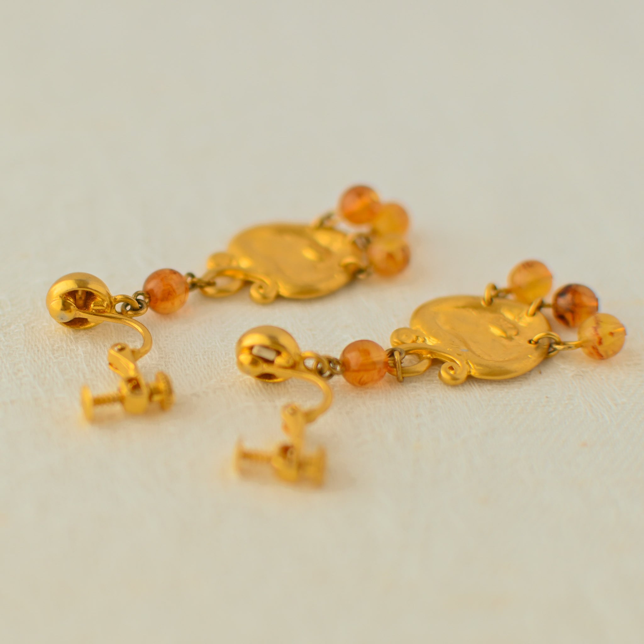 These vintage earrings channel a spirited blend of ethnic charm and refined elegance. With rich vintage gold tones and softly translucent glass beads in warm amber hues, they embody the free-spirited ethos of the 60s and 70s hippie and alternative cultures—while remaining effortlessly wearable in the modern day.