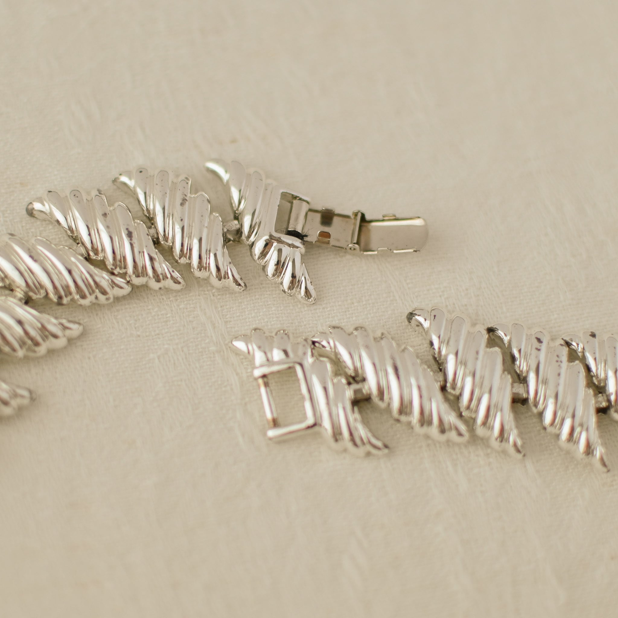 This vintage necklace strikes a beautiful balance between bold structure and intricate detail. Its layered motif of diagonally aligned, textured silver links creates a striking, abstract silhouette with a distinct cosmopolitan edge.